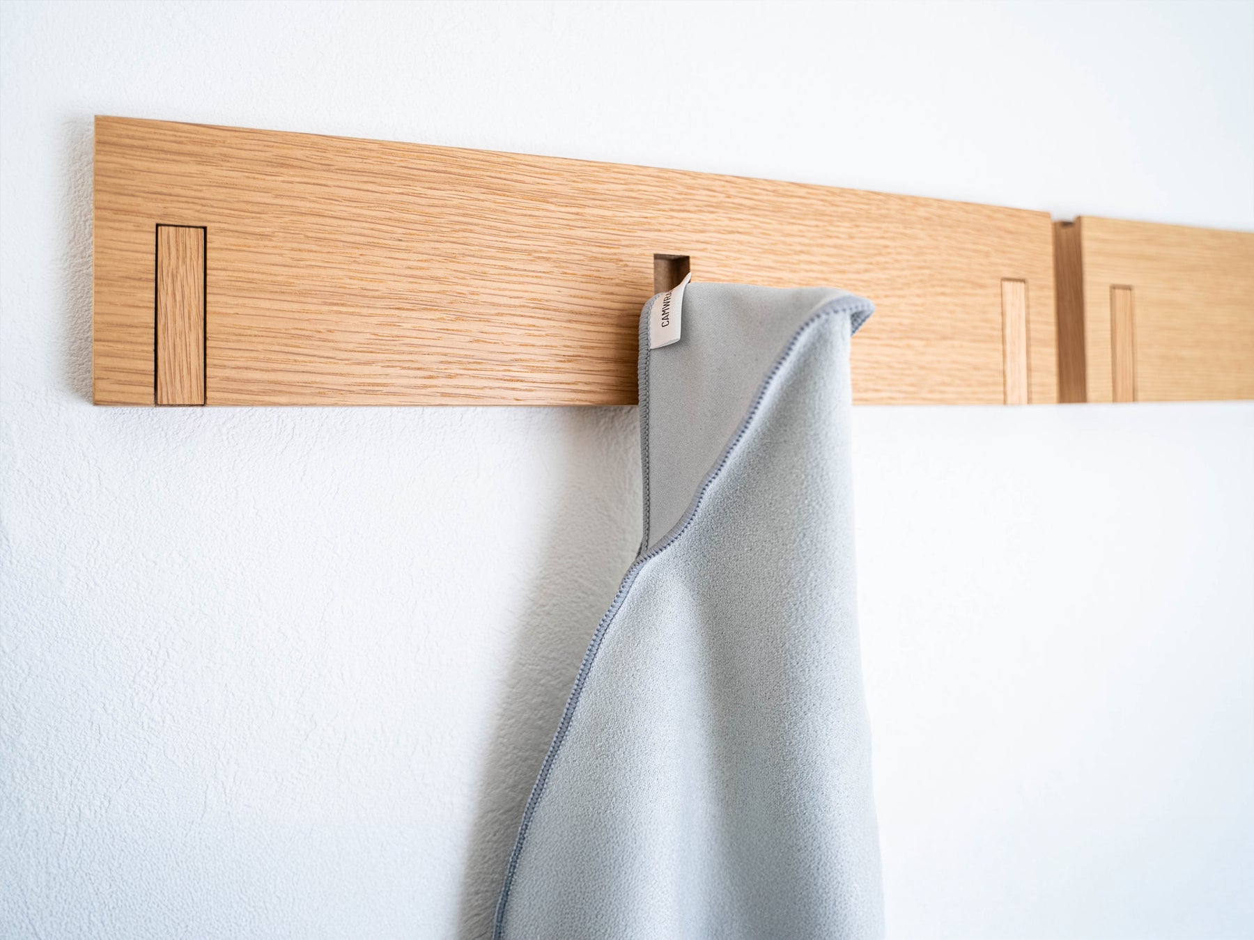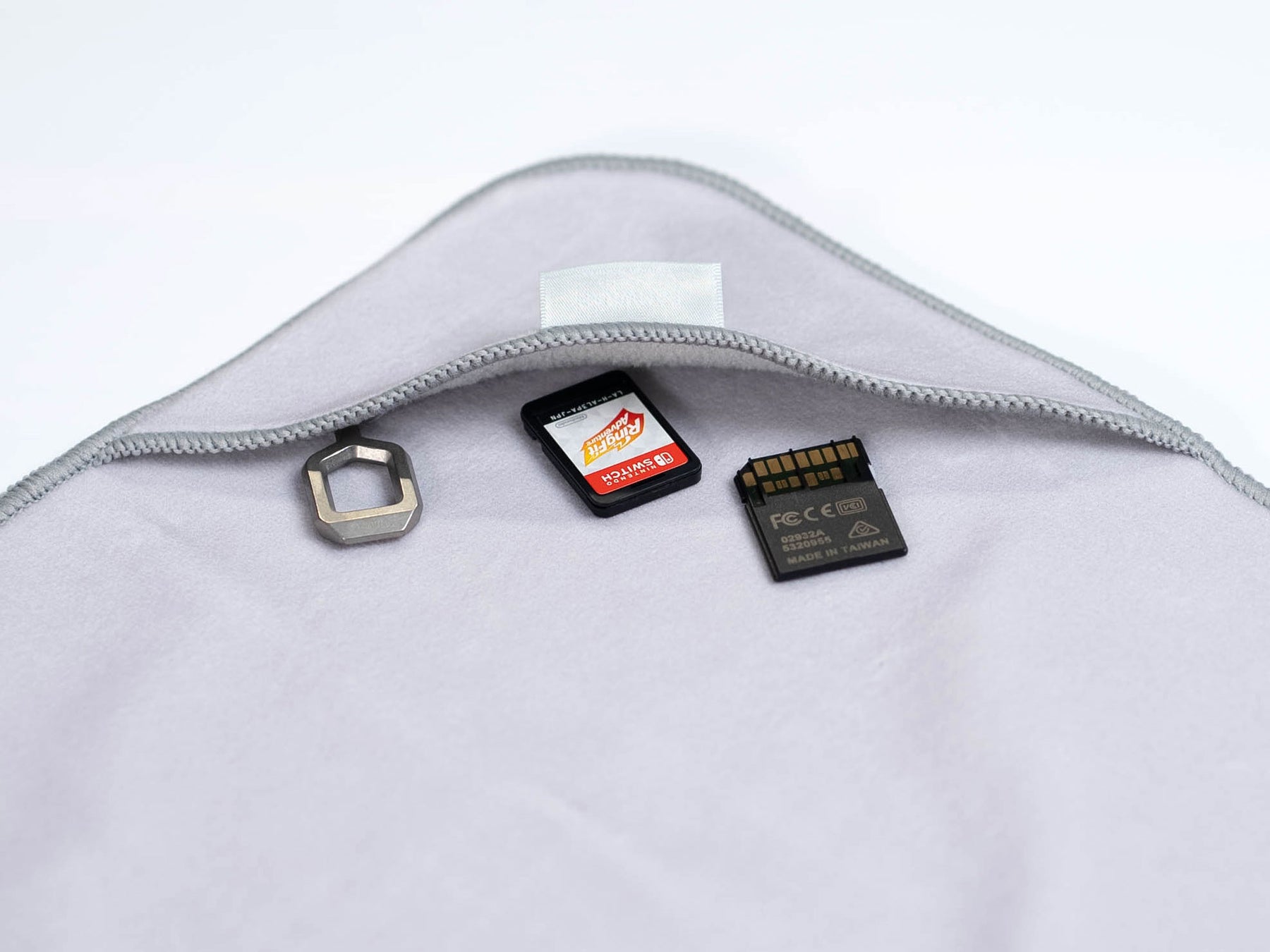 くっつく生地の特性を活かし一部、二重に裁縫することで三角形の小さなポケットを施し、カメラレンズキャップやSDカード、同社開発のCAMTWIST [カムツイスト] やゲームのソフトなどを収納でき、さらにその形状を活かし引っ掛けるだけで壁掛け収納することも可能です。