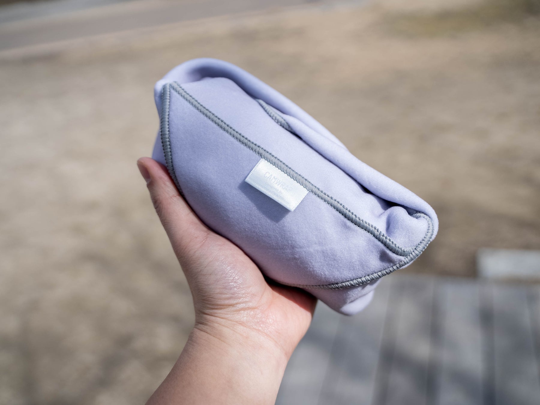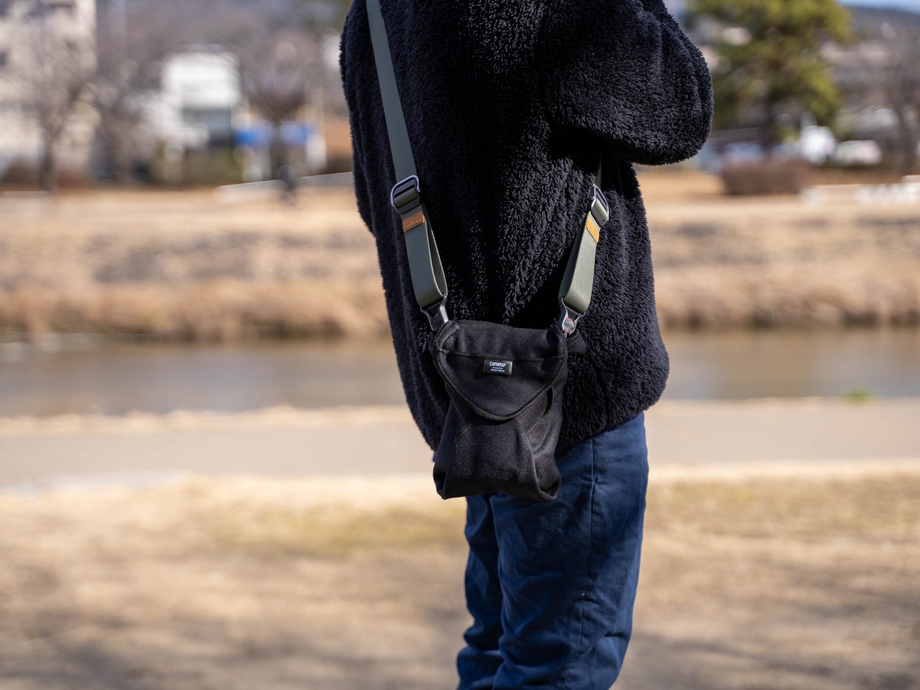 CAMWRAP [カムラップ] の生地の色は単色のブラック・グレーの2色展開でシンプルかつミニマルに包んでいただけます。 また、ロゴが配置されたラベルを上に引っ張ると”くっつく三角ポケット”が剥がれ小物を入れやすくなります。