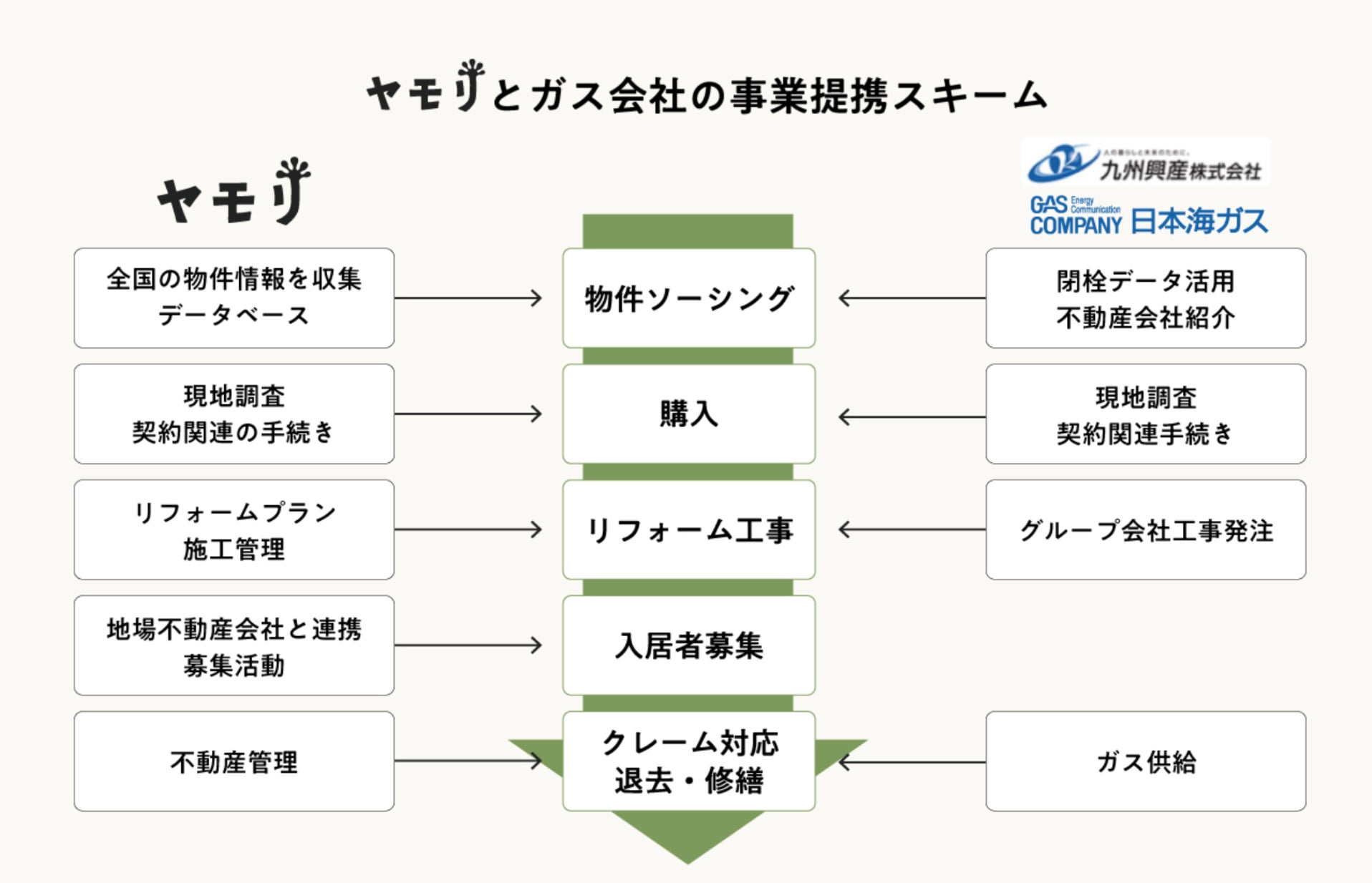 株式会社ヤモリ(本社:東京都渋谷区、代表取締役:藤澤正太郎、以下「ヤモリ」)はこの度、空き家再生賃貸事業において、日本海ガス株式会社(本社:富山県、代表取締役社長:新田洋太朗、以下「日本海ガス」)および九州ガスグループの九州興産株式会社(本社:長崎県、代表取締役:栗林宏光、以下「九州興産」)と各社業務提携を締結しましたので、お知らせいたします。