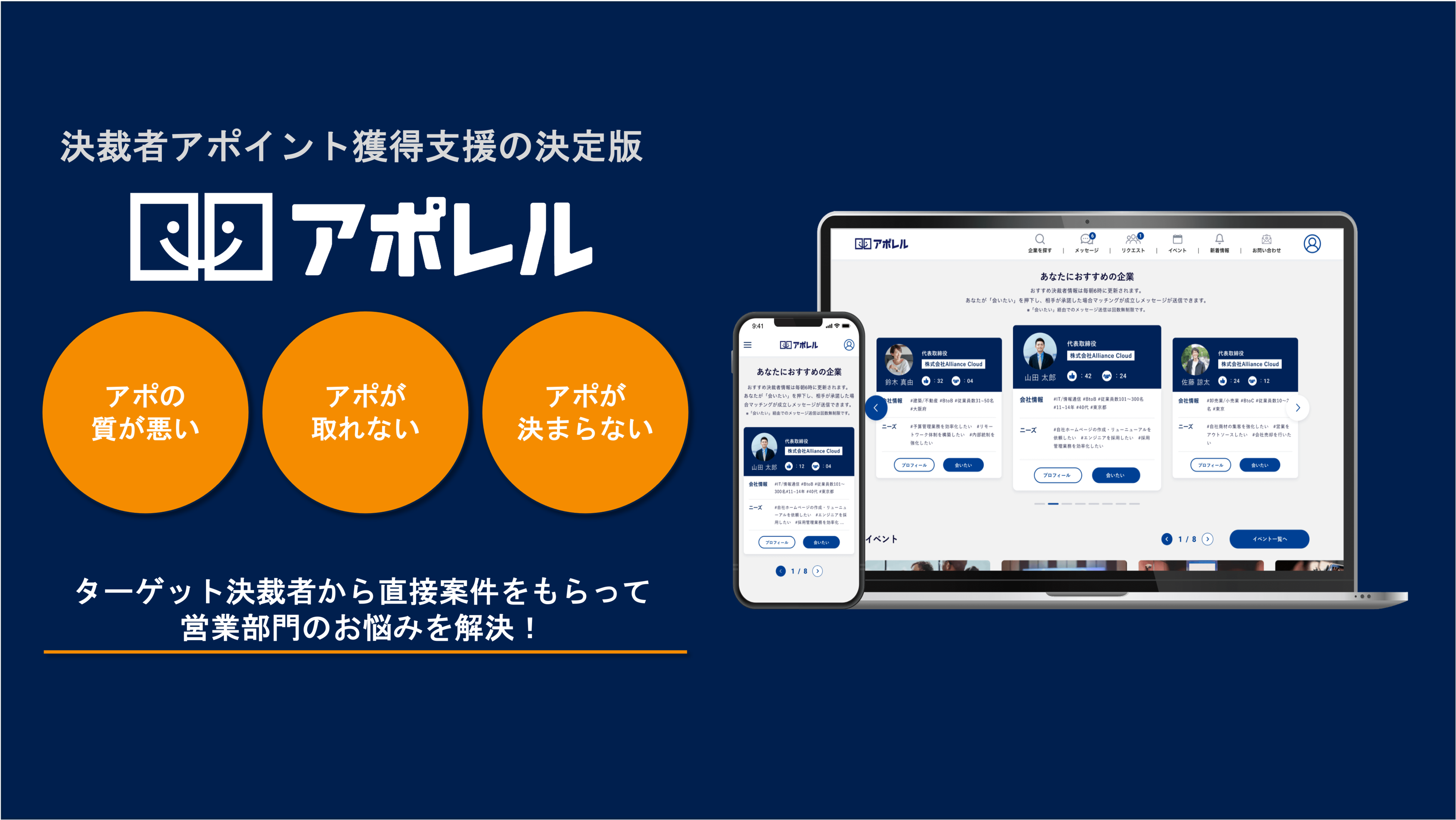 アポレルは、オンライン完結で決裁者にアポが取れる完全審査制の決裁者アポ獲得⽀援SaaSです。⾃社営業マンに代わりオンライン完結型の営業活動を⾏うことで⾃社営業リソースを増やすことなく、効率的かつスピーディーな決裁者アポイント獲得を実現します。顧客企業の決裁者と直接マッチングすることで、成約可能性の⾼い新規リードのみを獲得することや、アプローチから契約締結までの時間を短縮することができるようになります。