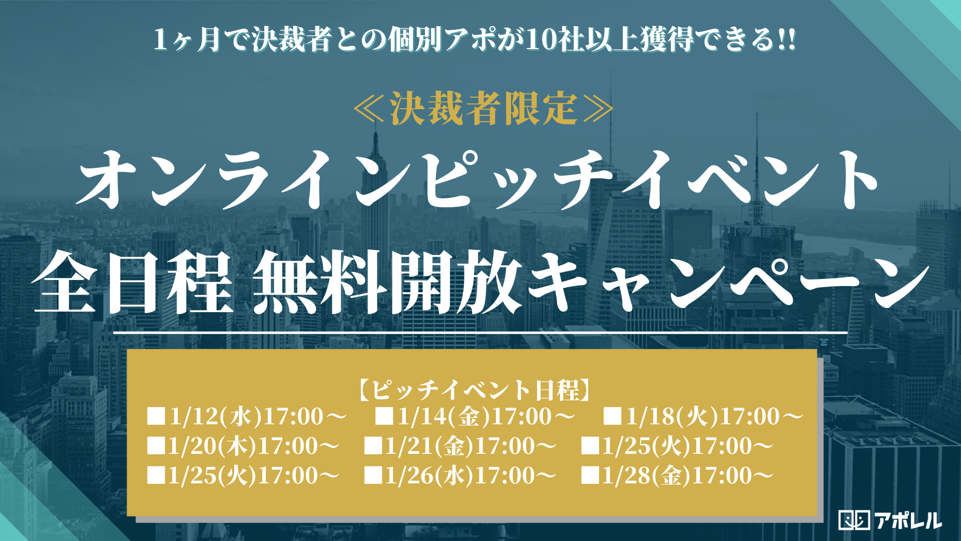 アポレルでは、現在、10社以上の決裁者との個別アポを獲得できる 「オンラインピッチイベント」に1ヶ月間無料でご参加いただける「オンラインピッチイベント 全日程 無料開放キャンペーン」を開催しております。