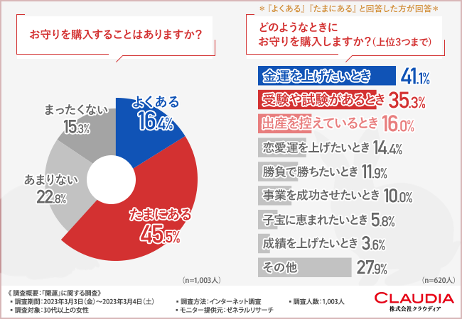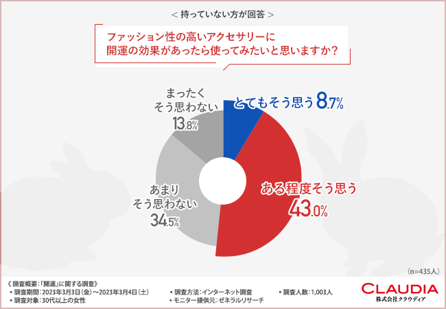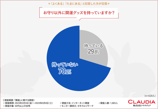 そこで今回、東京・南麻布の瑞華院の『うさぎのお守りジュエリー』 (URL挿入予定)を販売する株式会社クラウディア (https://www.claudia.co.jp/)は、30代以上の女性を対象に、「開運」に関する調査 を実施しました。