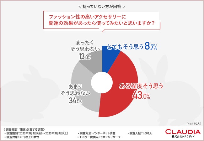 「ファッション性の高いアクセサリーに開運の効果があったら使ってみたいと思いますか?」と質問したところ、5割以上の方が『とてもそう思う(8.7%)』『ある程度そう思う(43.0%)』 と回答しました。