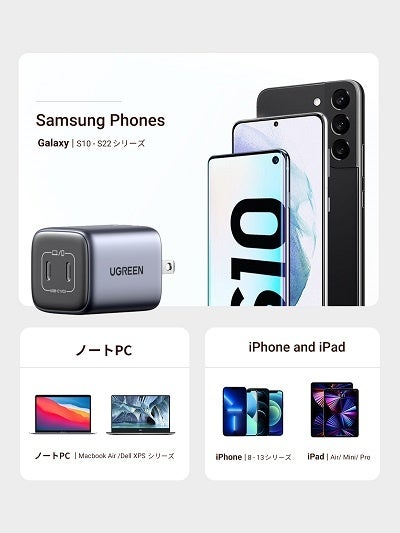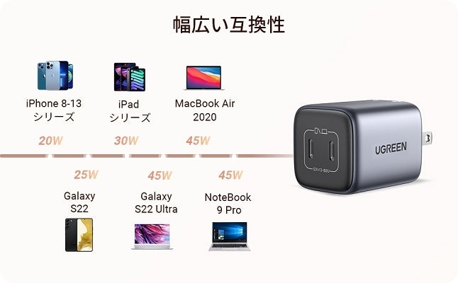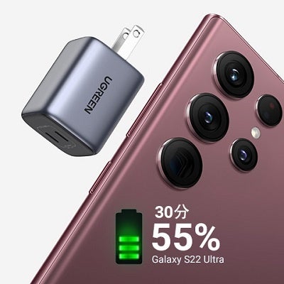 2つのUSB-Cポートを搭載し、どちらも単ポートで45Wの高出力に対応。携帯から、タブレット、ノートPCまで、あらゆるポータブルデバイスの急速充電ニーズをカバーできます。Apple社新型のデュアルポート35W充電器と比べ、UGREEN Nexode Mini 45W急速充電器はさらに高出力に対応しました。また、PPS 45W超高速充電規格にも対応。PPS 25W出力でしか充電できない他の充電器に対し、Galaxy S22 Ultraでも最大速度で充電することができる最新のType-C充電器です。