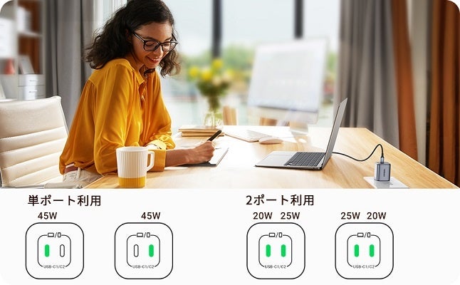 | 出力 | 単ポート出力: C1/C2:5V/3A 9V/3A 12V/3A 15V/3A 20V/2.25A 45W Max PPS:3.3-11V/4.05A 2ポート同時出力: C1+C2:PD25W+PD20W/PD20W+PD25W |