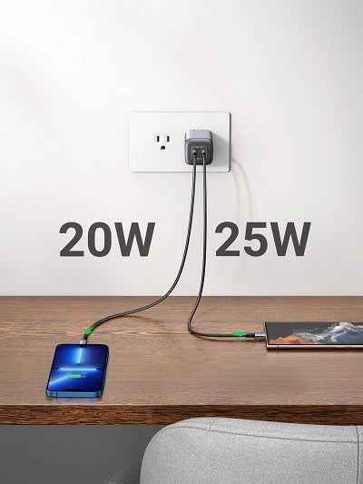 デュアルUSB-Cポートで2つのモバイルデバイスを同時にフルスピードで充電します。25W+20W出力の組み合わせて2台のデバイスを同時に急速充電可能。また、PD3.0、PPS、QC4+(QC4.0/QC3.0)、FCP、AFC、5V2.4A、BC1.2など、複数の急速充電プロトコルをサポートし、互換性に優れ、あらゆるデバイスに充電対応します。