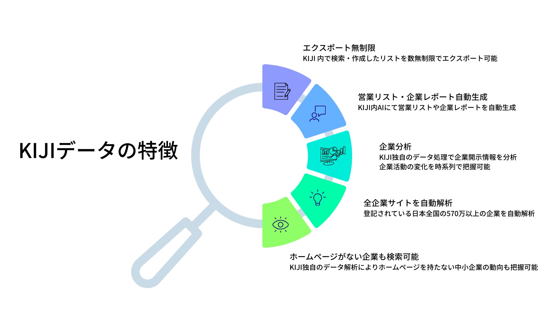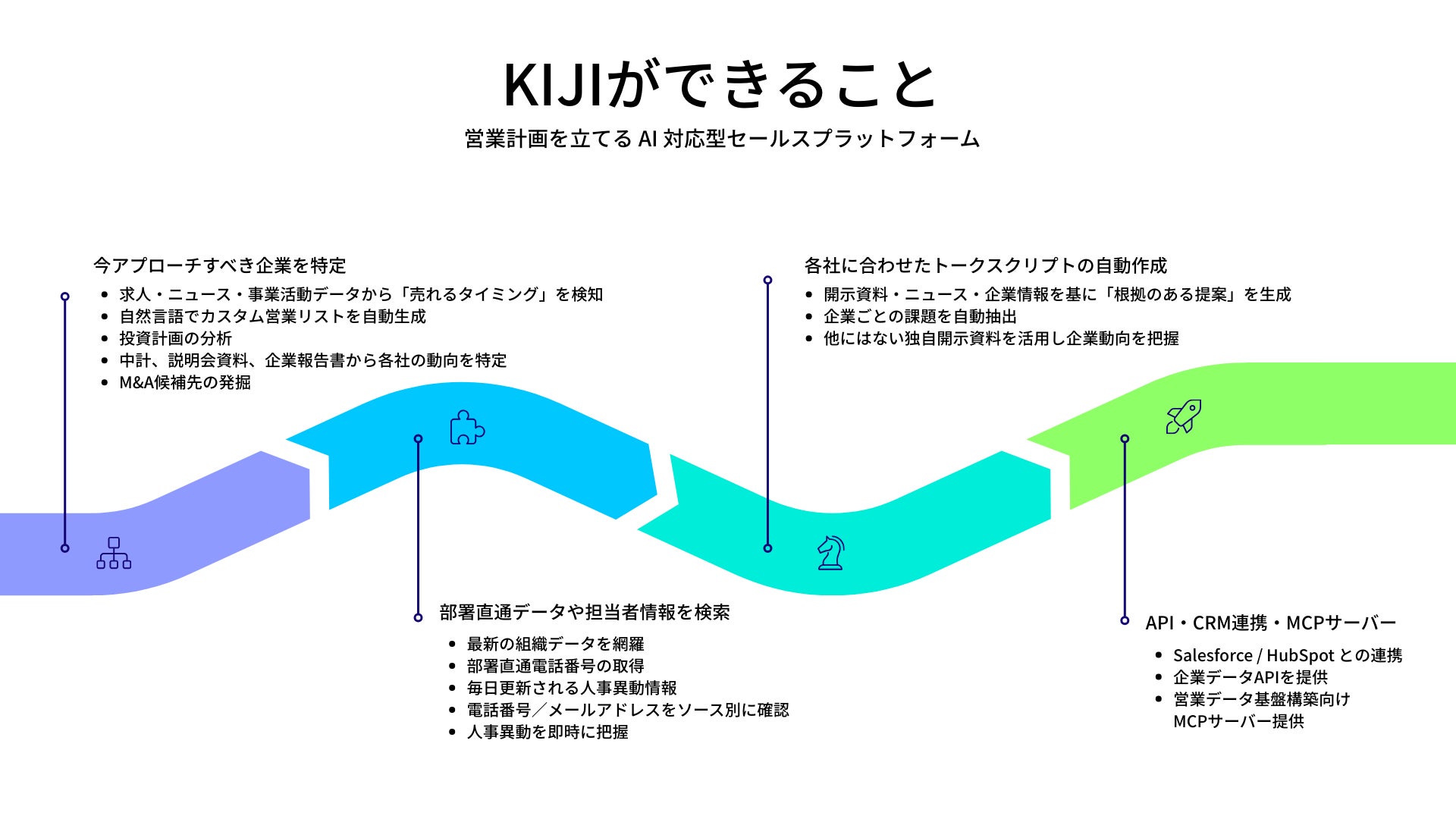 「KIJI」は企業活動の変化を時系列で把握できるUI、ユーザー主導での柔軟な分析、元データへ遡れる透明性を特徴とし、ビジネス現場の意思決定を直接支援する非財務データインフラとしてご活用いただけます。