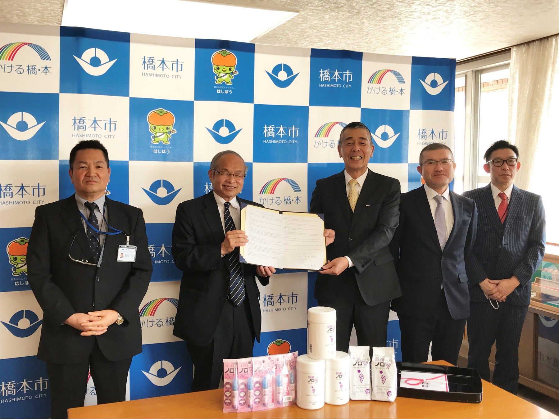 今回は、ESG経営の一環としてウイルス感染拡大防止にお役立ていただくために、改めて和歌山県橋本市へ寄贈を行い、3月9日に橋本市役所 市長室にて協定調印式を実施いたしました。
