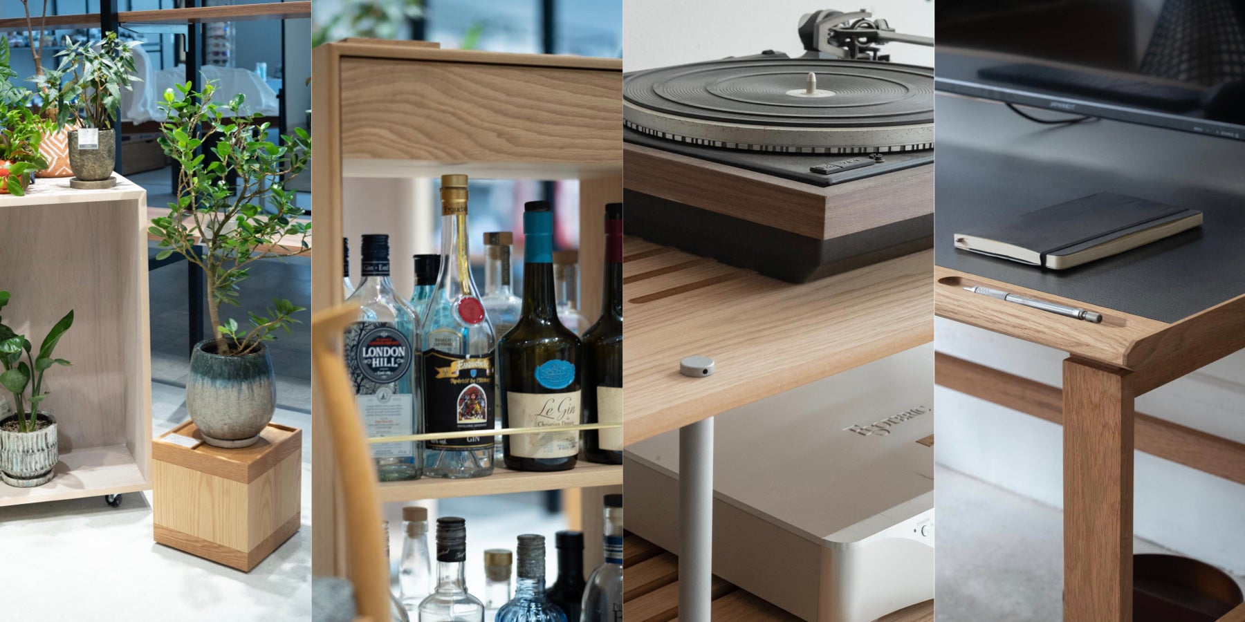 家具本体のみの展示ではなくレコードやオーディオ機器、ウイスキーボトルや観葉植物など、それぞれのスタイルで使われる「アイテム」を家具にセッティングした上で展示させていただくので、より「趣味のための家具」としてのコンセプトが伝わる雰囲気の空間となっています。