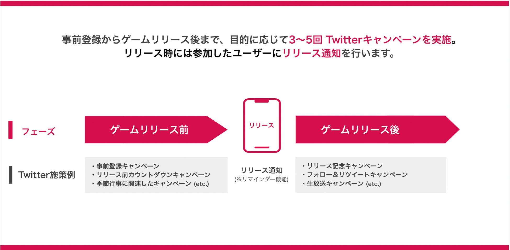 事前登録パッケージは、事前登録からゲームリリース後まで、Twitterキャンペーンの複数回実施と、オプションのリマインダー機能を使用したリリース通知が可能です。特に、ゲームリリース後に行うゲームアプリ内の誘導を目的としたTwitterキャンペーンは、Web遷移型インスタントウィンツール特有の施策です。これにより、過去Twitterキャンペーンに参加したユーザーへ新規ゲームアプリをインストールするよう促すことが可能となり、Twitterフォロワーからインストールへの転換率を最大化します。