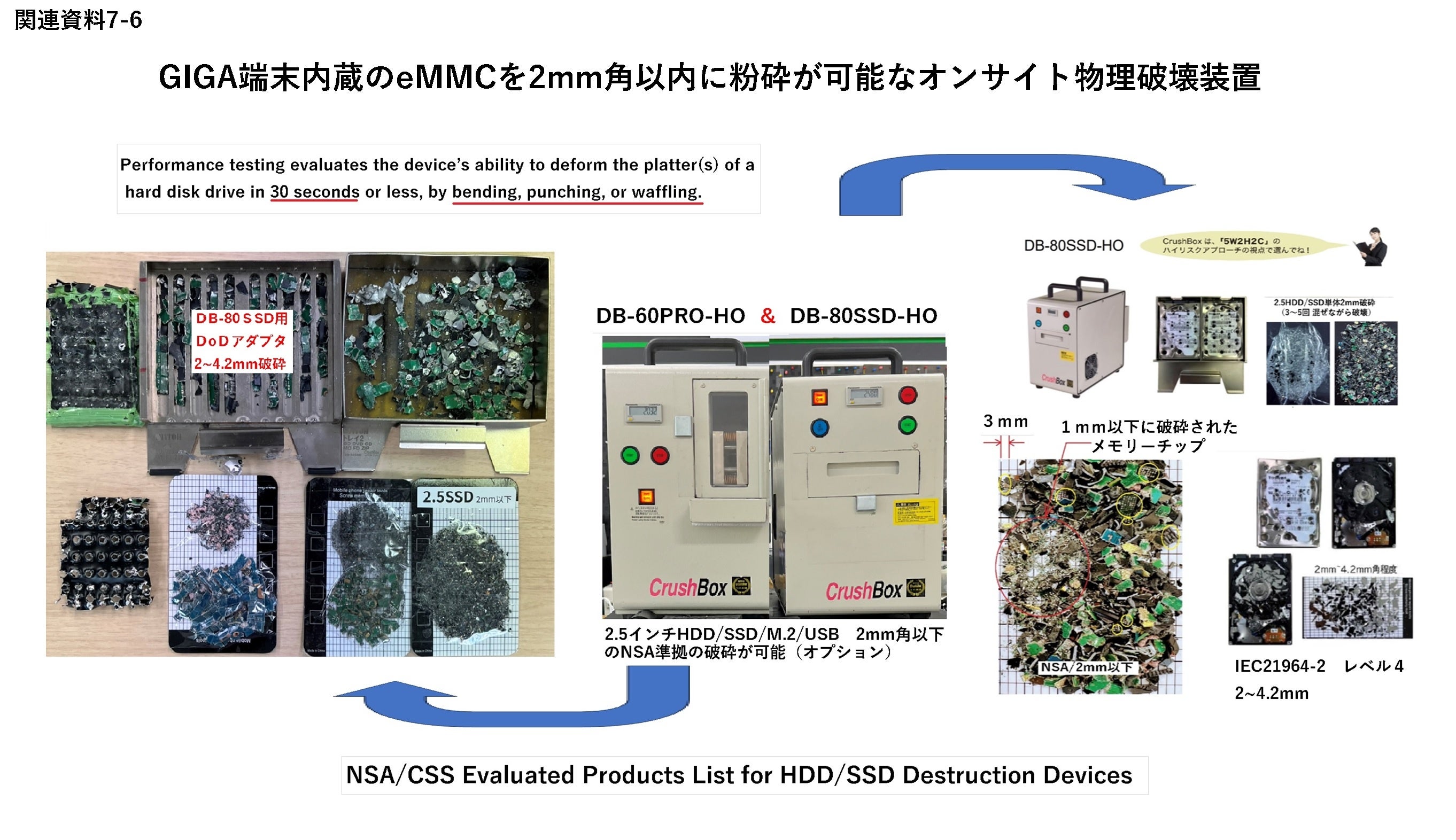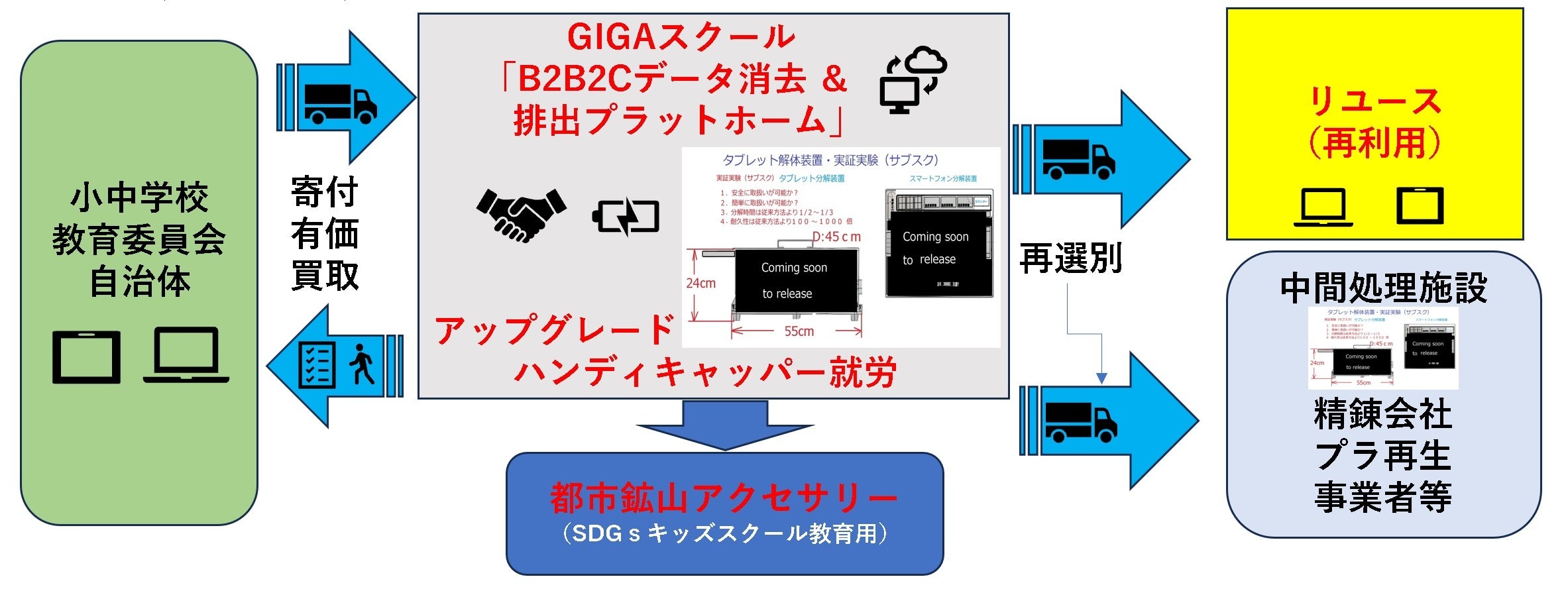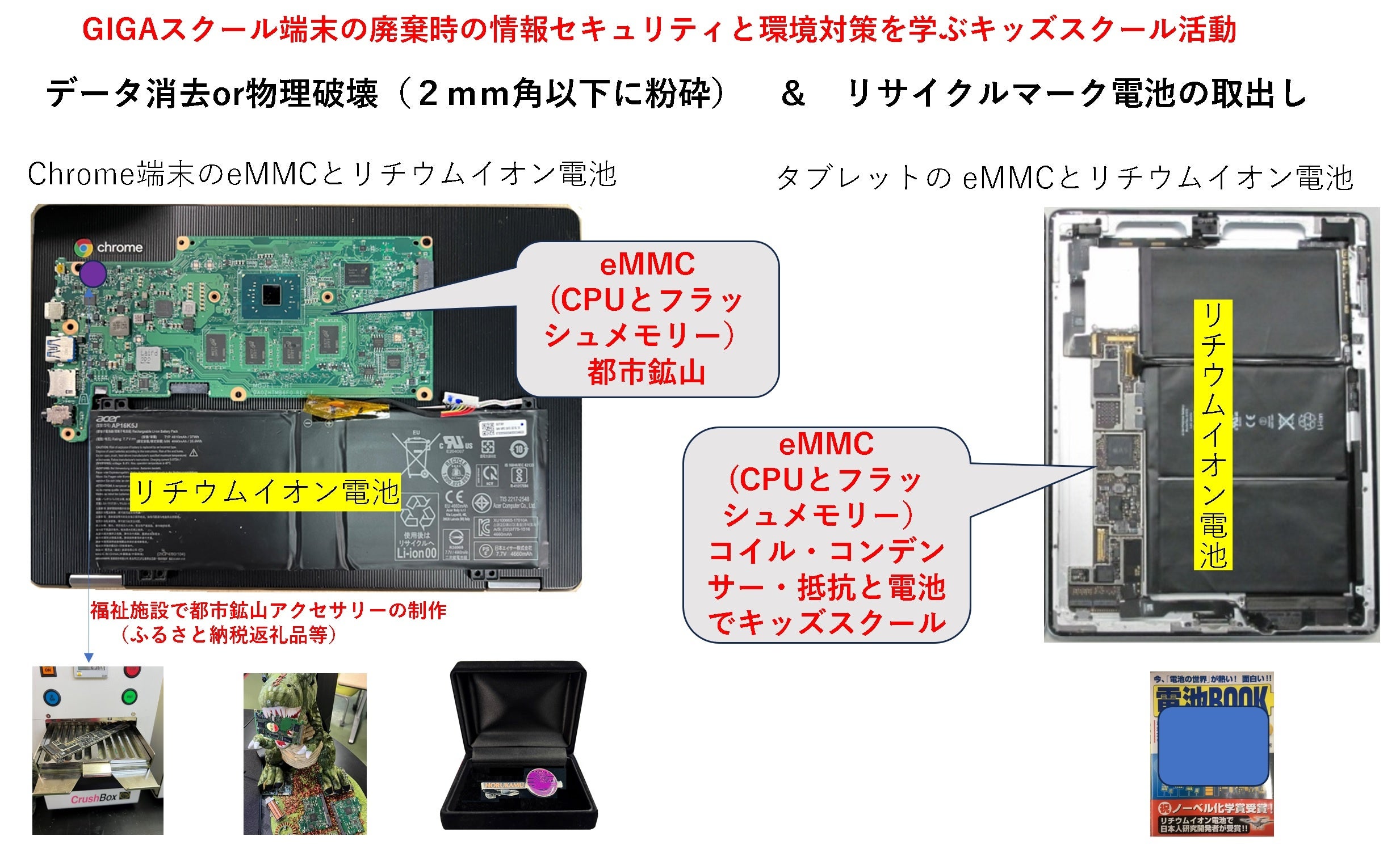 文部科学省のGIGAスクール構想で排出するパソコン・タブレット端末には、生徒・家族・教職員の機密情報が含まれていて、リユース・リサイクルプロセスのデータ消去(証拠証明)とバッテリー(リチウムイオン電池)の取出しが方法(データ改ざん防止と・危険な作業)が課題になっています。