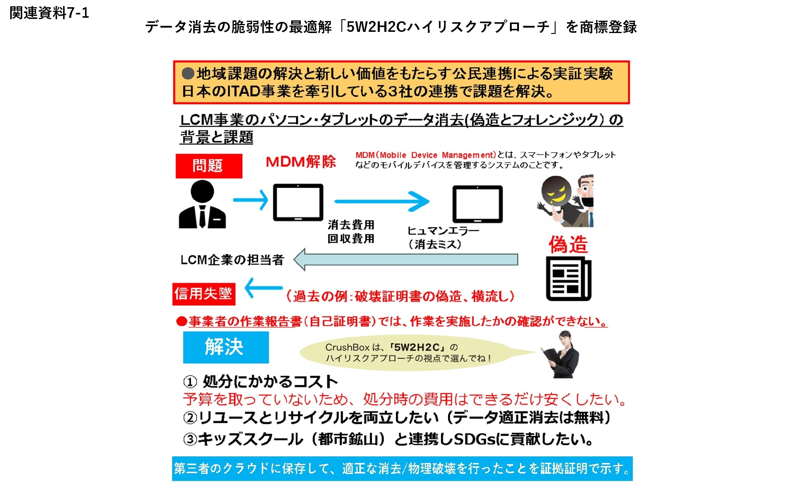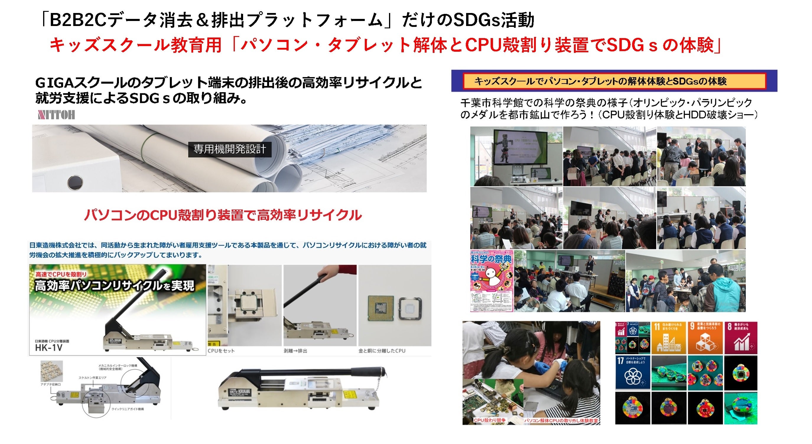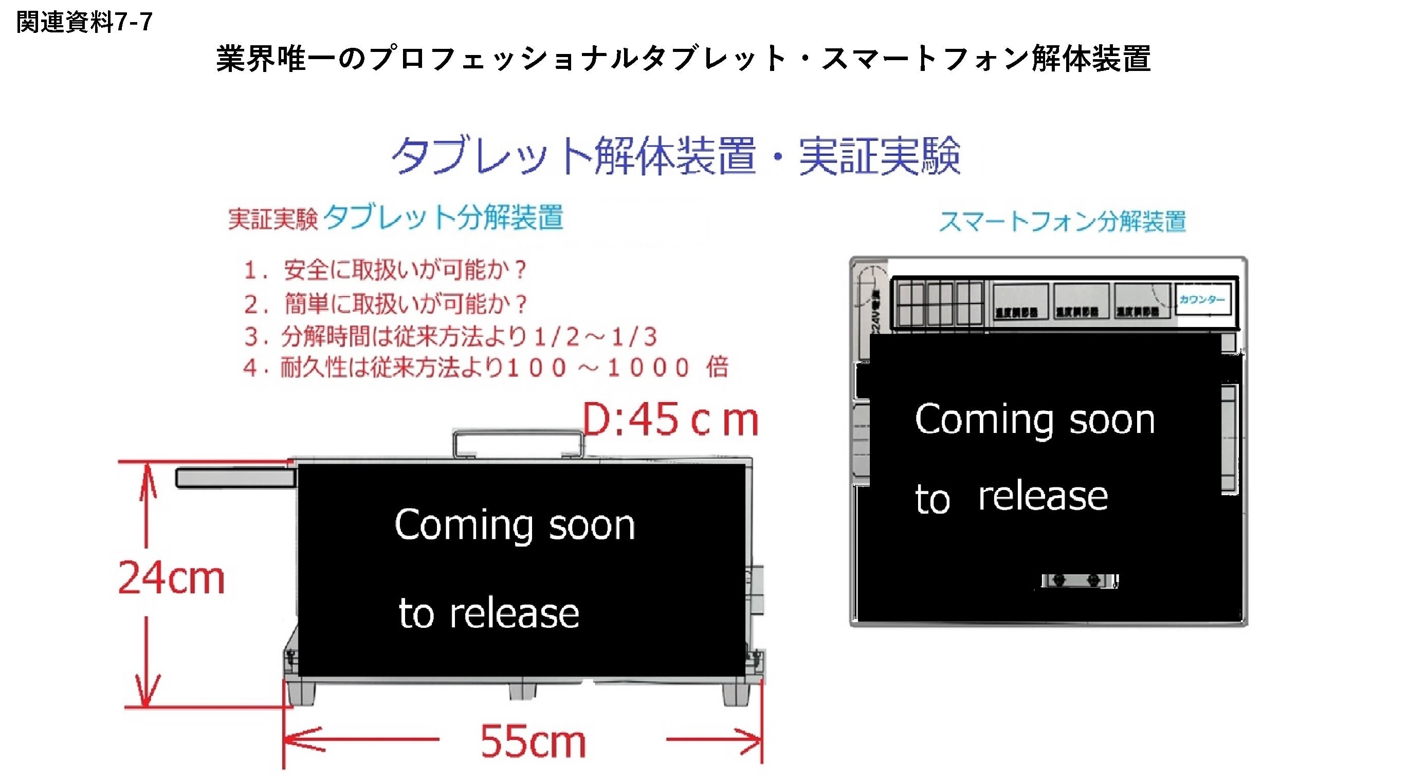文部科学省のGIGAスクール構想で排出するパソコン・タブレット端末には、生徒・家族・教職員の機密情報が含まれていて、リユース・リサイクルプロセスのデータ消去(証拠証明)とバッテリー(リチウムイオン電池)の取出しが方法(データ改ざん防止と・危険な作業)が課題になっています。