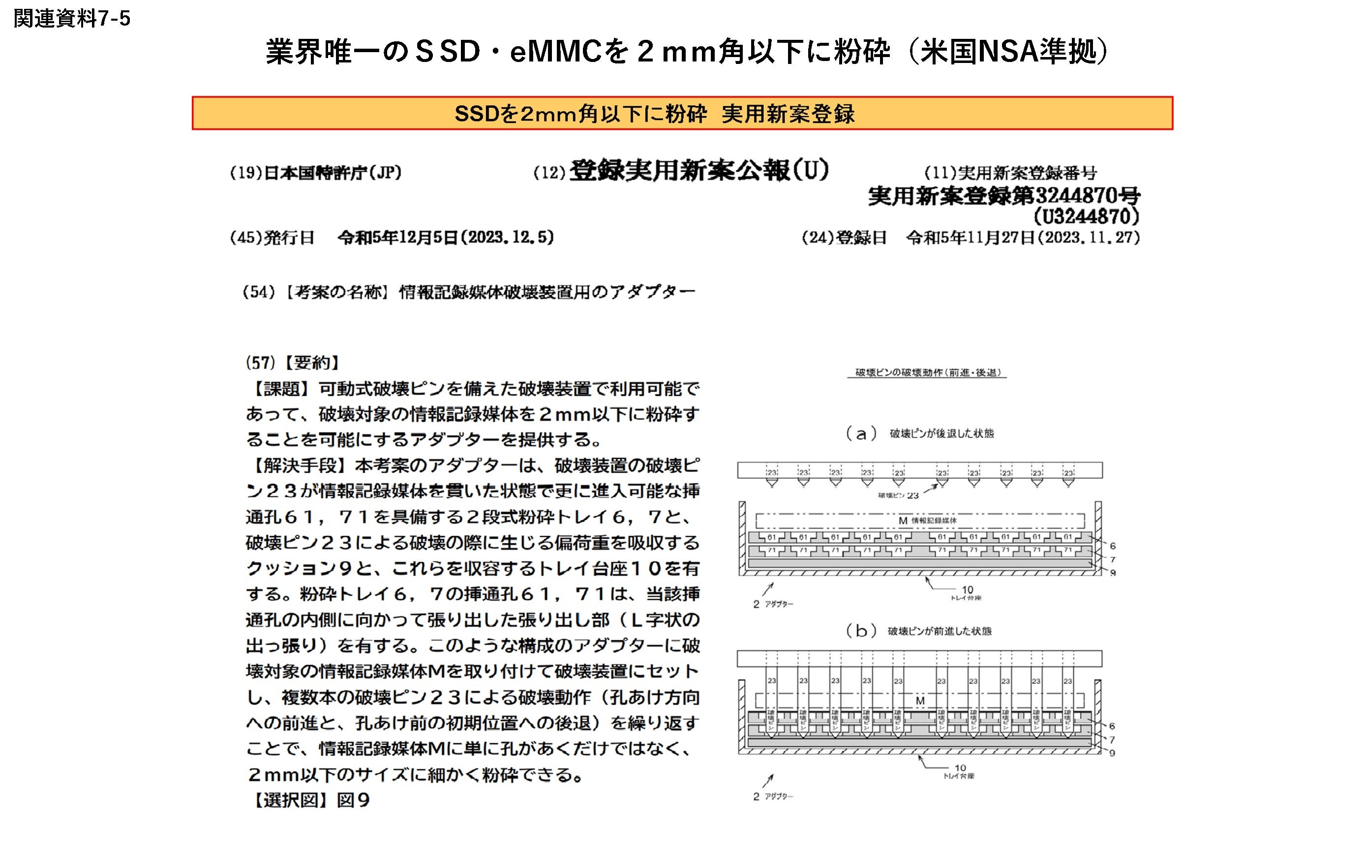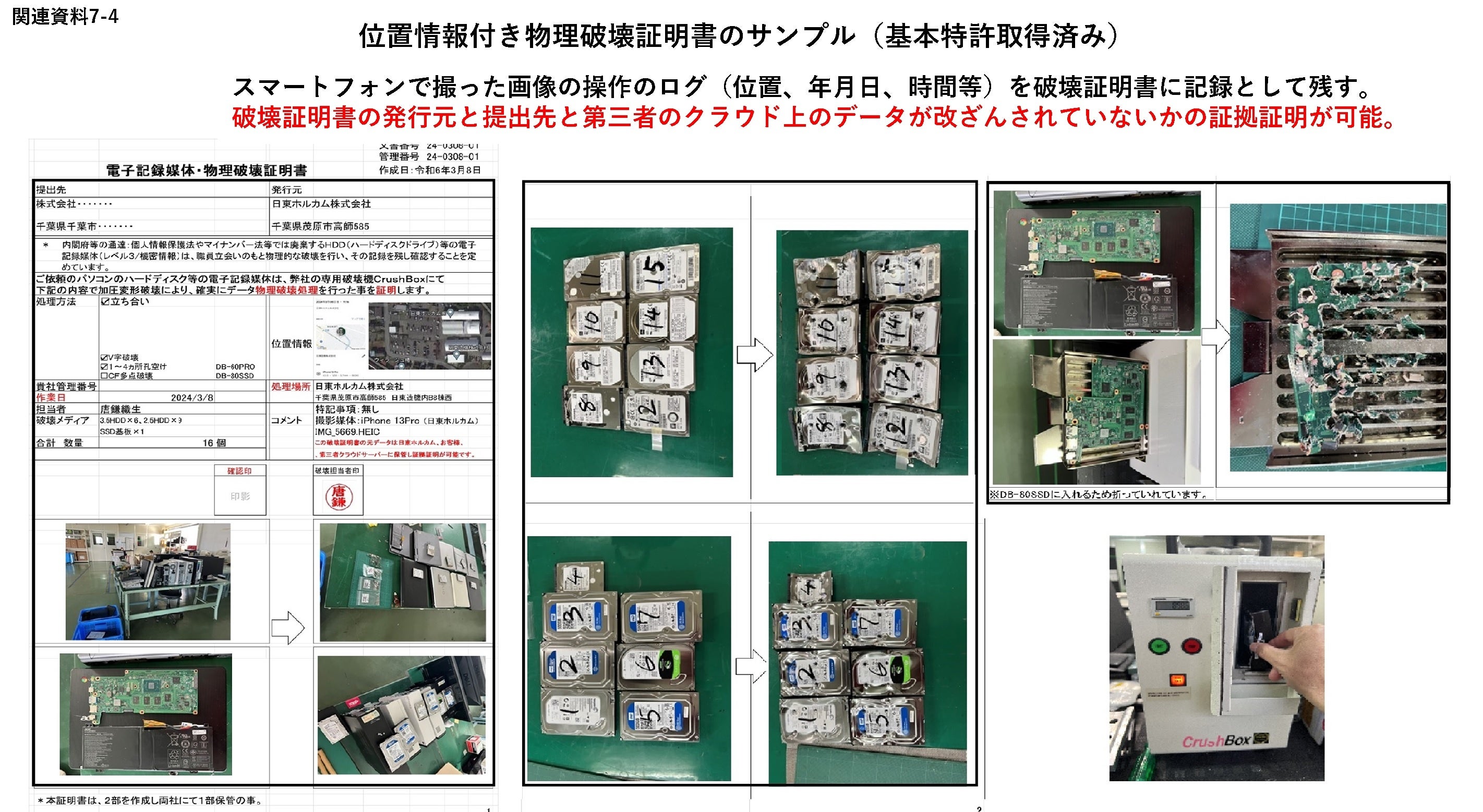 ⽇東ホルカムは⽇東造機CrushBoxシリーズの販売・レンタル・CrushBoxサービスリセラーの⽀援を主とした事業を展開、HDD/SSD物理破壊機は世界28カ国に販売、国内では20年間連続シェアナンバーワンメーカーとして、油圧応⽤の基本特許をはじめ運⽤管理(データ消去等のトレーサビリティ)の世界特許や実用新案を取得、製品の⻑寿命・安全・簡便性は多くの企業・官公庁・ITAD業界等、様々なお客様よりご愛顧いただいております。