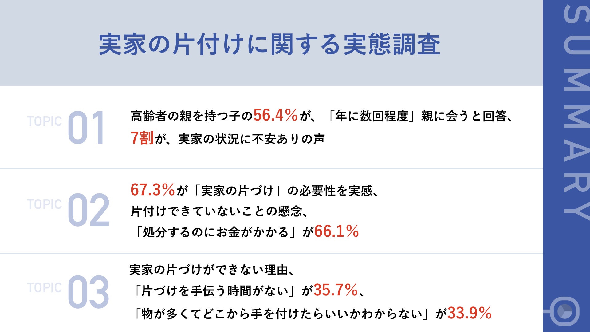 - 約7割が、実家の「片づけ」の必要性を実感