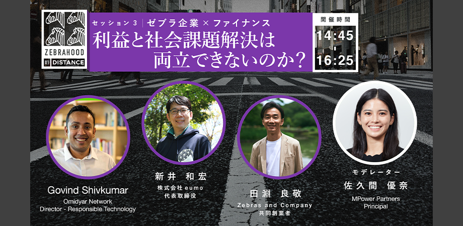 “持続的である“というサステナビリティから派生した“再生的“という意味合いを持つ「リジェネレイティブ」。本イベントでは、「リジェネレイティブ」という新しい概念の中でも、ゼブラの概念に紐付き社会課題を解決するために収益をつくる・また収益性が増すほどに社会課題の解決が持続するビジネスとは、どうのように生まれ続いていくのかというヒントを話し合う。