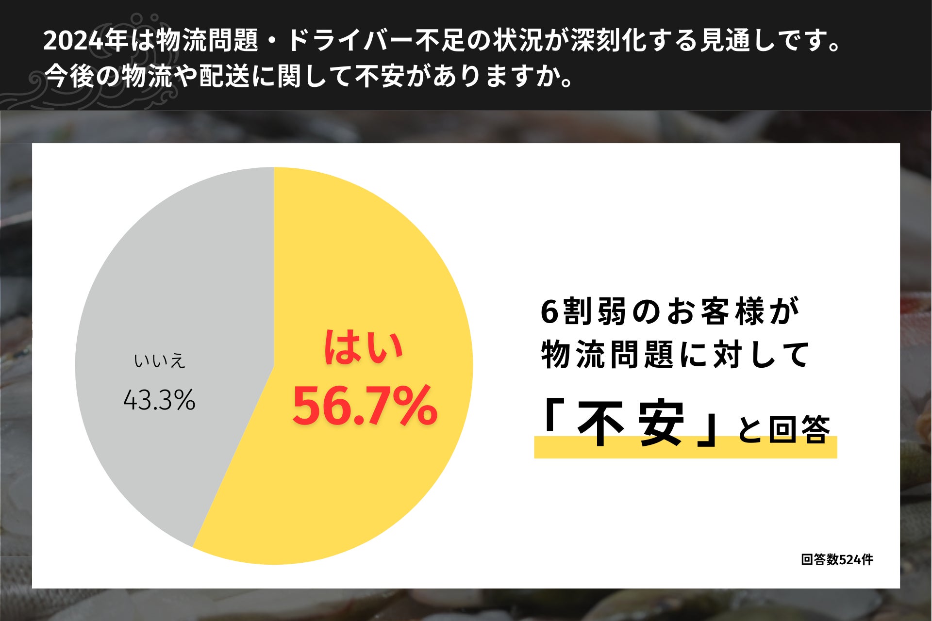 株式会社 弁慶丸(鳥取県鳥取市、代表取締役 河西千明、以下「弁慶丸」)が2007年より開始した、「鮮魚通販・弁慶丸とれたて直送便」の利用者を中心としたメルマガ読者1万8千名超へアンケートを実施したところ、524名から回答が得られ、社会問題となっている2024年の物流問題に対し、過半数を超える約57%が不安に感じていることがわかりました。