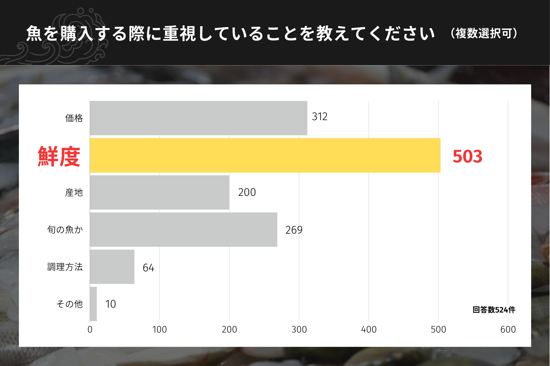 「魚を購入する際に重視していること」に503人(96%)が「鮮度」と回答する当社のお客様らしく、フリーワード記載の具体的な不安への回答も「鮮度」が一番であり、続いて「配送費の高騰」、その他にも「地方の新鮮な魚が東京などに入りにくくなるのではないか。」「ドライバーさんへの負担がどこまで軽減されるか?」などの回答もありました。