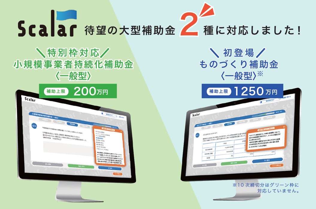 Scalar株式会社(本社:東京都渋谷区、代表取締役:吉田光志)は、同社が提供する補助金申請書の作成支援クラウドサービス「Scalar(スカラー)」において、「小規模事業者持続化補助金<一般型> 特別枠」及び「ものづくり・商業・サービス生産性向上促進補助金(以下、ものづくり補助金)<一般型>」に対応いたしました。