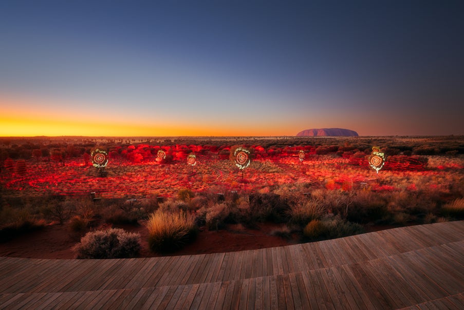 環境に配慮した方法でウルルに建設された屋外円形劇場では、6台の30Wレーザー、7台の12KWプロジェクター、30台のフィールドライトが連動し、壮大なストーリーを天然のキャンバスに描き出します。