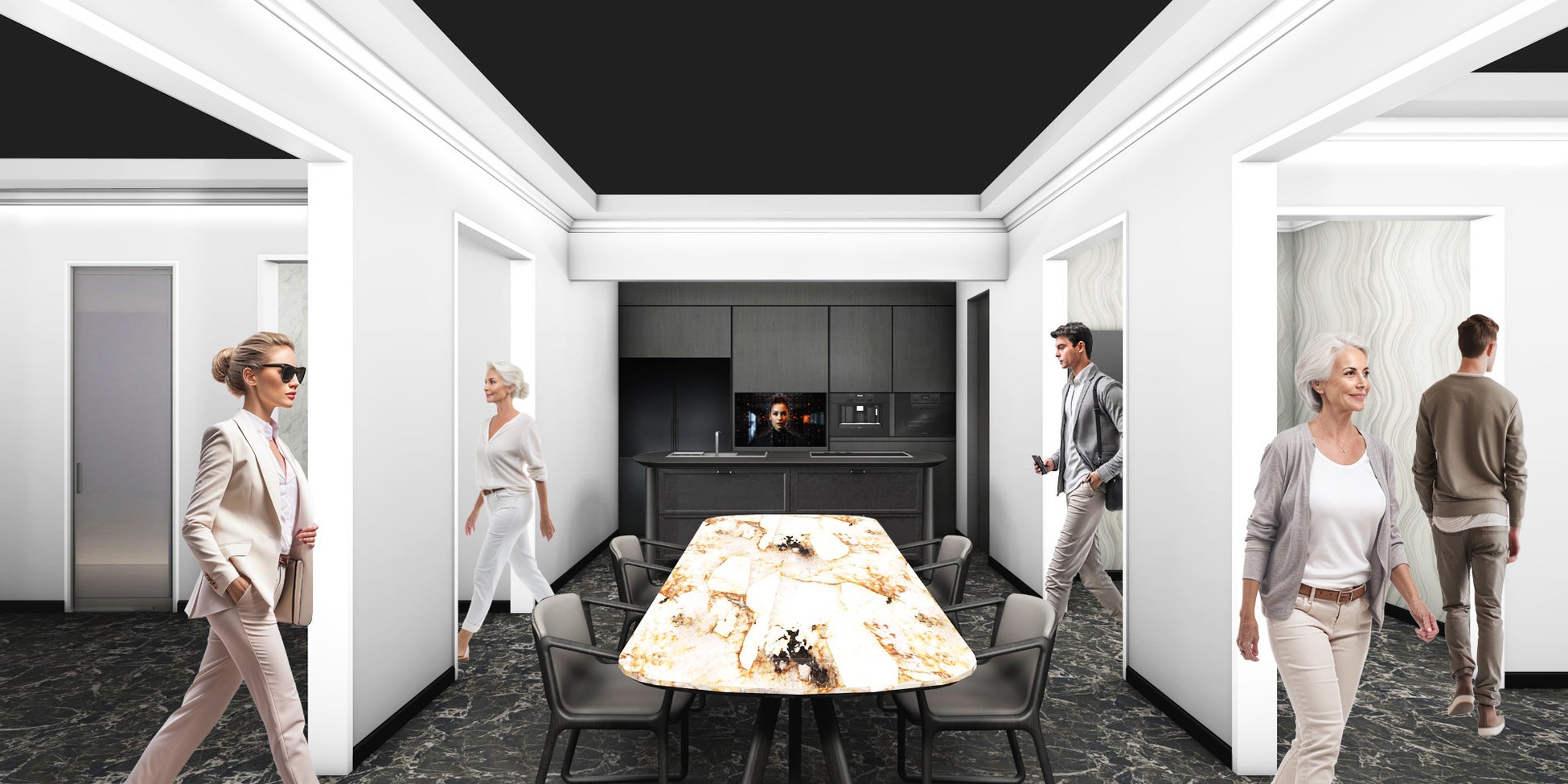 当パビリオンは、大阪・関西万博のテーマ「いのち輝く未来社会のデザイン」に重ね合わせ、飯田グループが考える「誰もがあたり前に、健康に長く、安全・快適に暮らせる未来社会」を描きます。