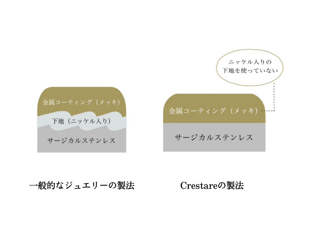 Crestareのジュエリーはベースの素材にサージカルステンレスを使用しているため、金属アレルギー反応が起きにくいとされており、さらにコーティング工程にも配慮をしています。