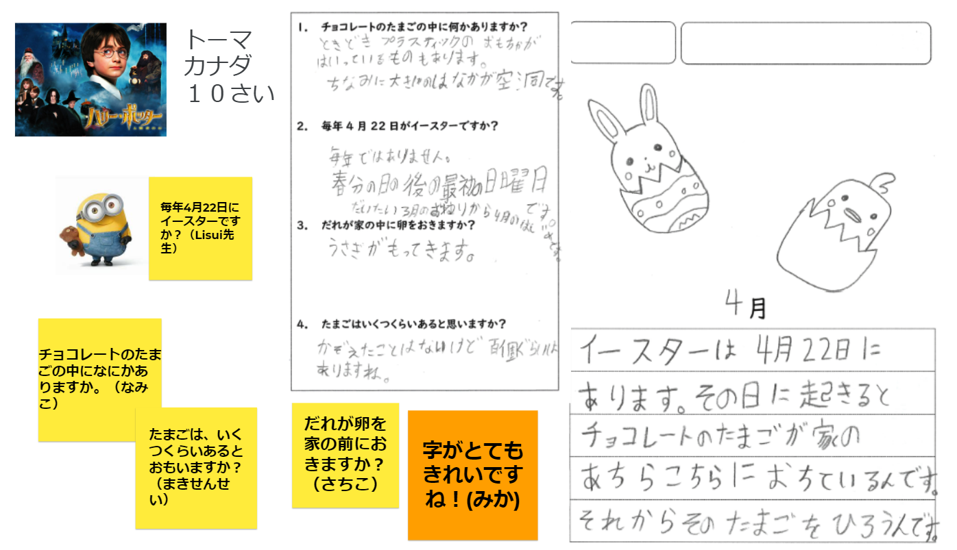 授業時間内でカレンダー作りをしていたと、担当の生徒さんは、講師の私がイースターを知らないと聞いて、実物のお菓子を持ってきてくれたり、自分のわかる単語を調べながら一生懸命説明してくれました。