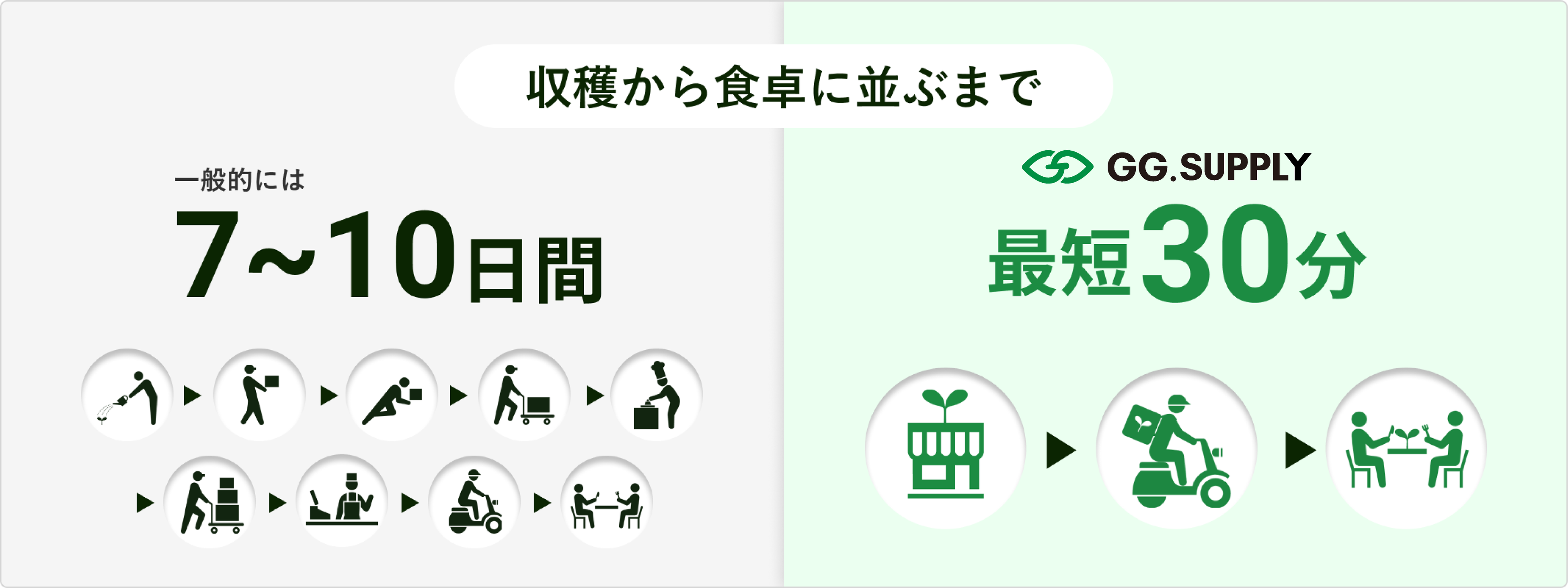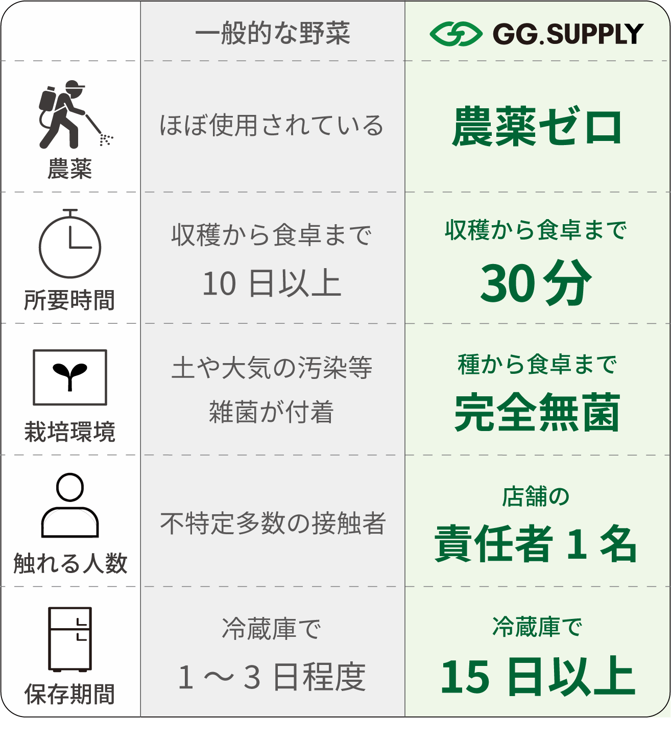 GG.SUPPLYは店舗で種から育てた無菌状態の無農薬野菜を直接ご自宅までデリバリーすることで収穫より30分以内で皆様の食卓にお届けします。