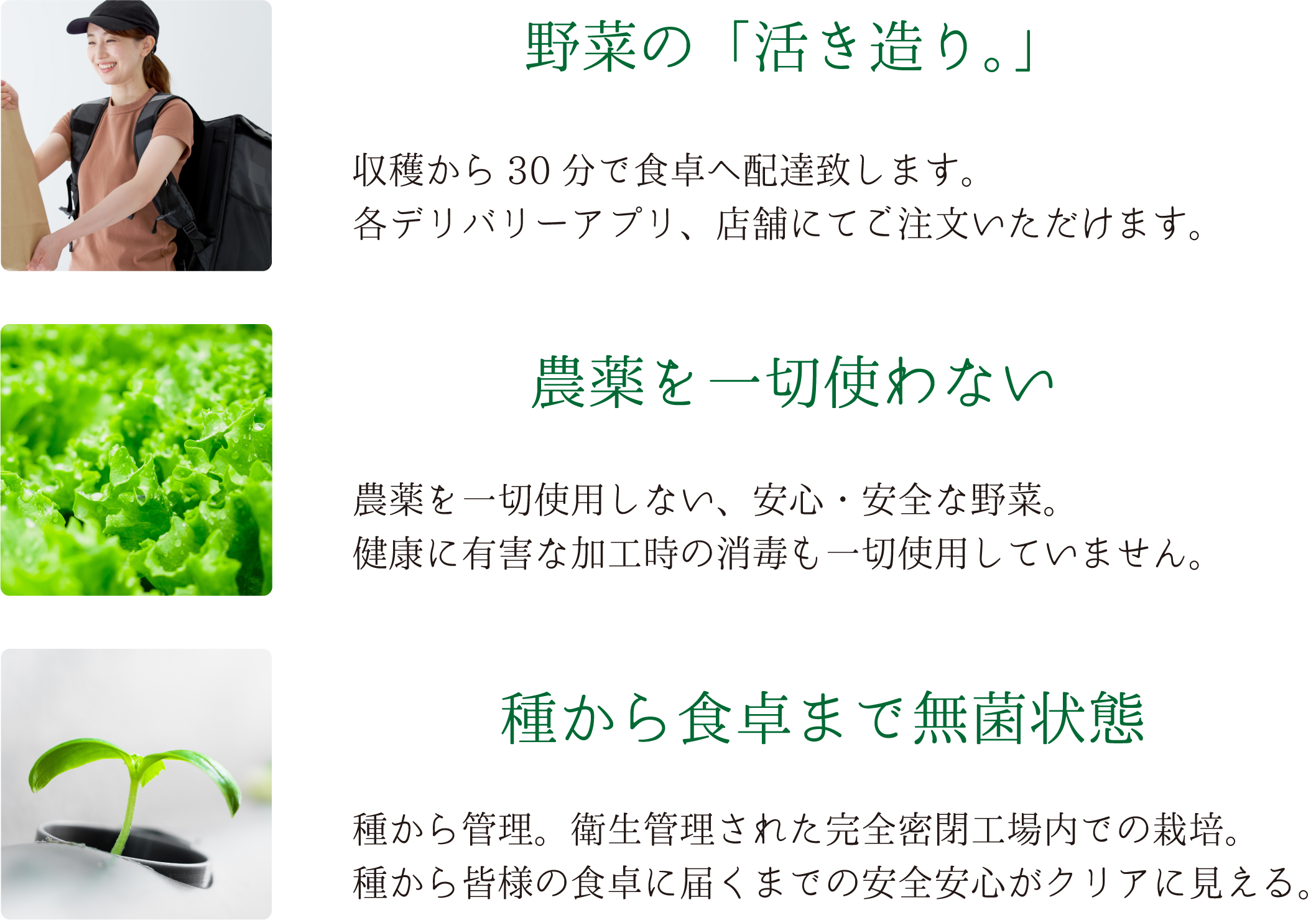 完全に密閉された店内にて水耕栽培を行うことで、収穫から30分以内に無菌・無農薬野菜をご自宅までデリバリーすることを可能にしました。