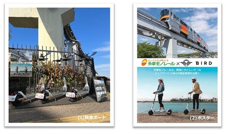 具体的な取組としては、本日(2022年1月14日)から多摩モノレール本社敷地内に電動キックボード(以下、「Bird」)のシェアリング用駐車ポートを設置するほか、Birdの認知拡大及び安全な利用方法の啓発に向け、駅構内やイベントスペースを活用したプロモーションを実施します。今後、両交通のシームレスな連携も見据え、さまざまな施策を検討してまいります。