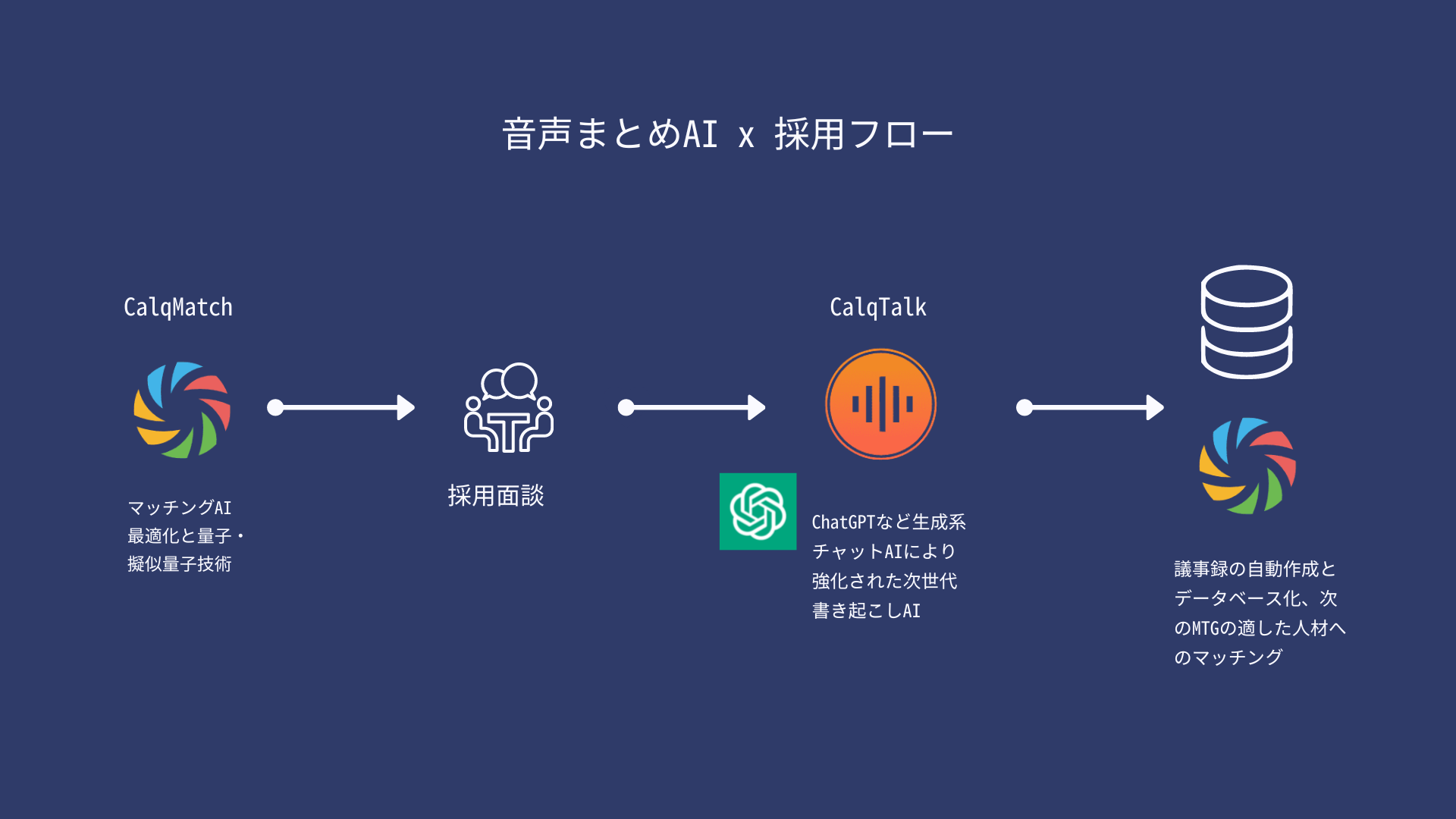 今後の展開として、当社CalqMatch(量子技術とAIを活用した次世代マッチングシステム)との接続を考えており、面談時のリアルタイムな人材、プロダクトの提案を実現し、当社CalqPM(量子技術とAIを活用したガントチャート生成AI)によるマネジメントの自動化まで構想しております。