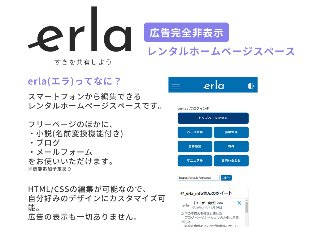 簡単操作でお洒落なページを作成!小説やブログなども自由に掲載できるレンタルホームページスペースです。erlaで「すき」を共有しよう。