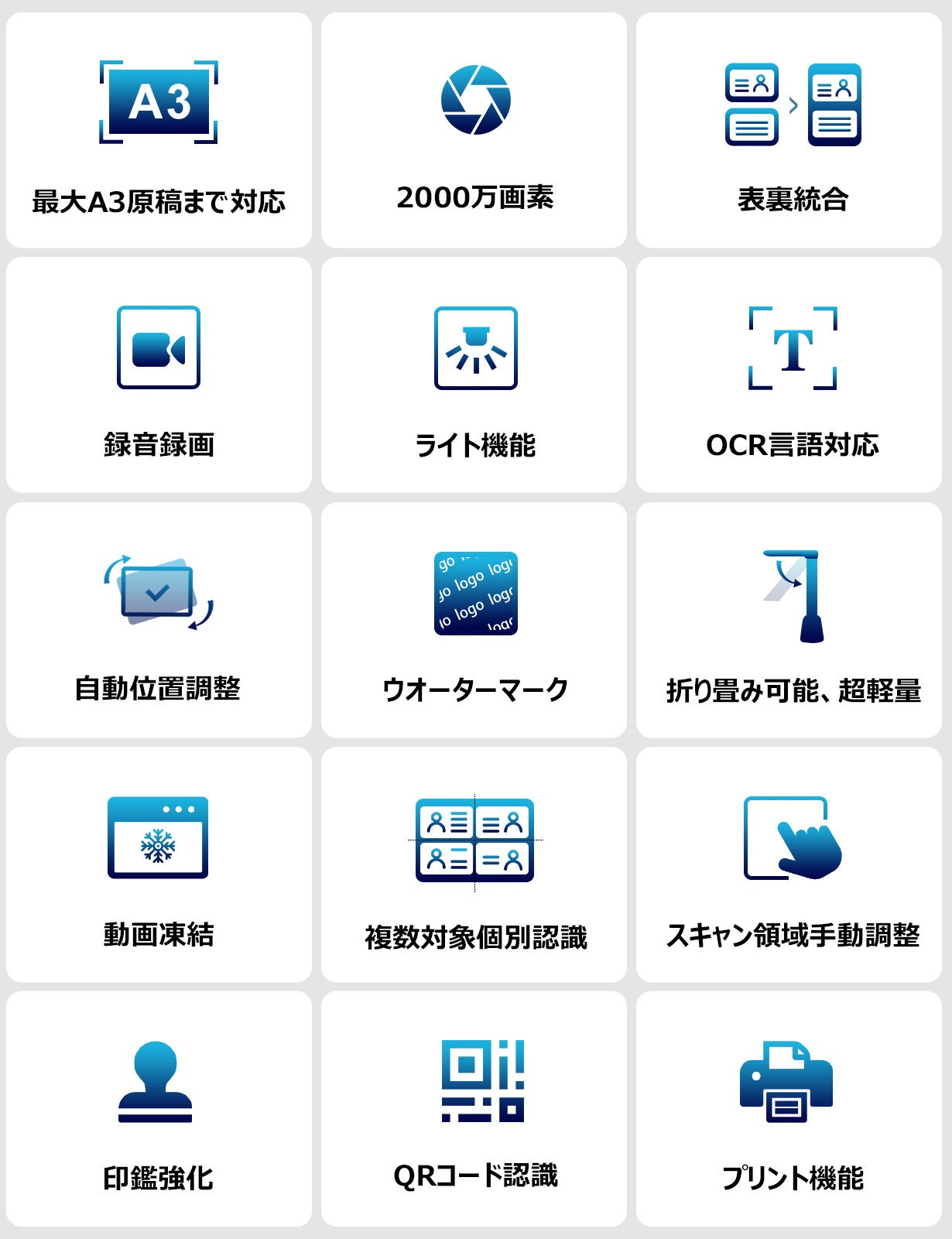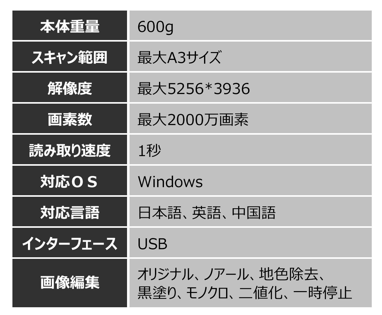 - 2000万画素の高解像度、多機能ソフトウェア付属、OCR光学的文字認識機能で、手軽にテキストデータに変換できます。