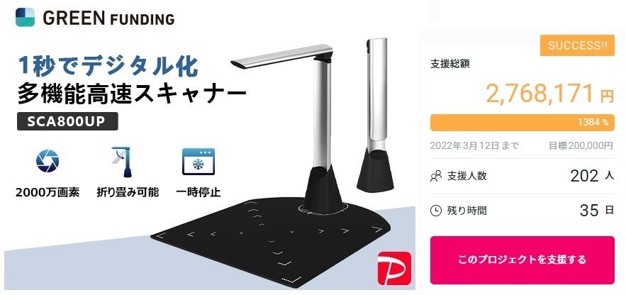 「ポータブルスキャンナー」は8時間でゴール達成! 2日間でサポーター300万円超え!GREEN FUNDINGのトップページで2位にランクイン!(※)現在、目標金額の1384%達成!(2月6日現在)