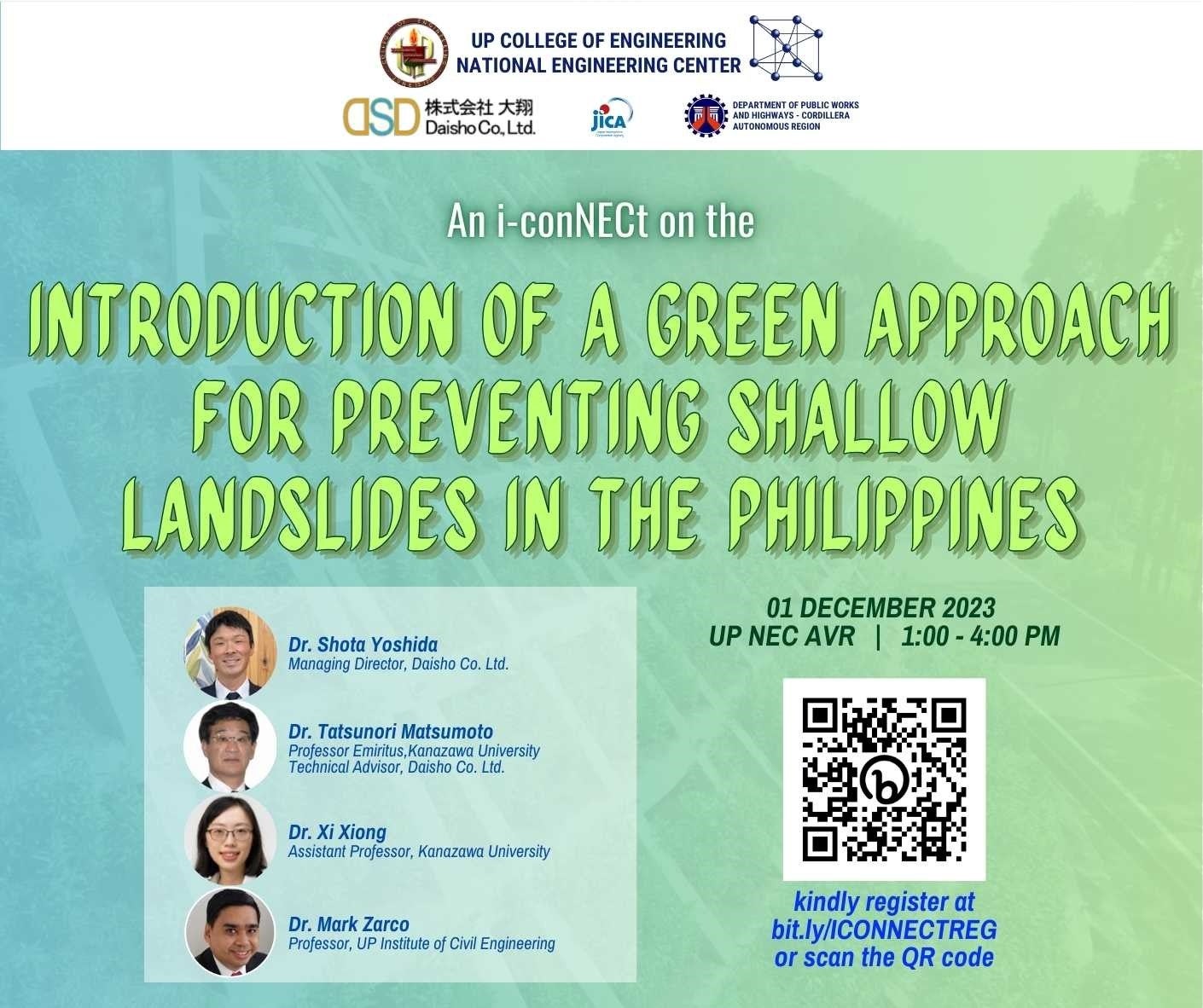 本セミナーでは「フィリピンの斜面防災」に関連して、フィリピン大学教授やJICA技術協力プロジェクト担当者が登壇するほか、大翔からは、実施中のJICA案件化調査状況および「森林を伐採しない環境に配慮した斜面保護技術」に関する発表を行います。
