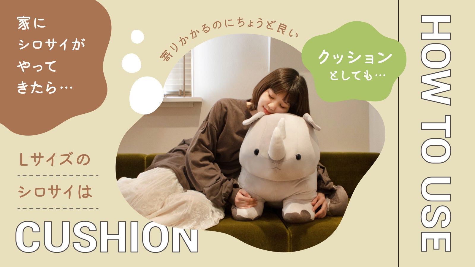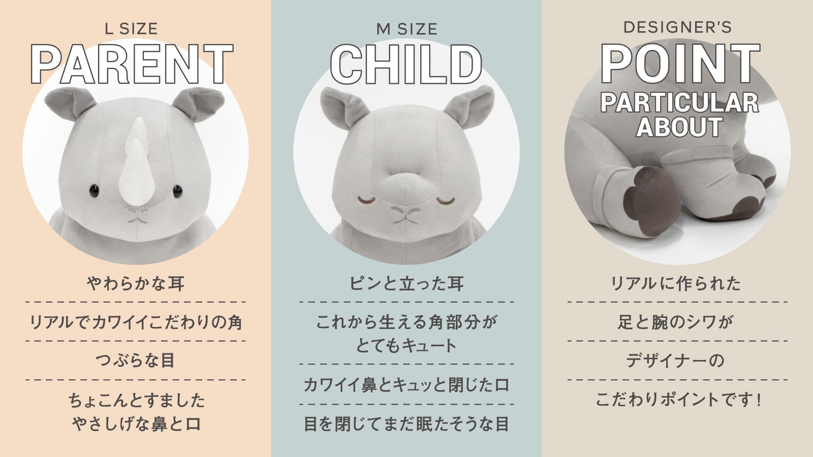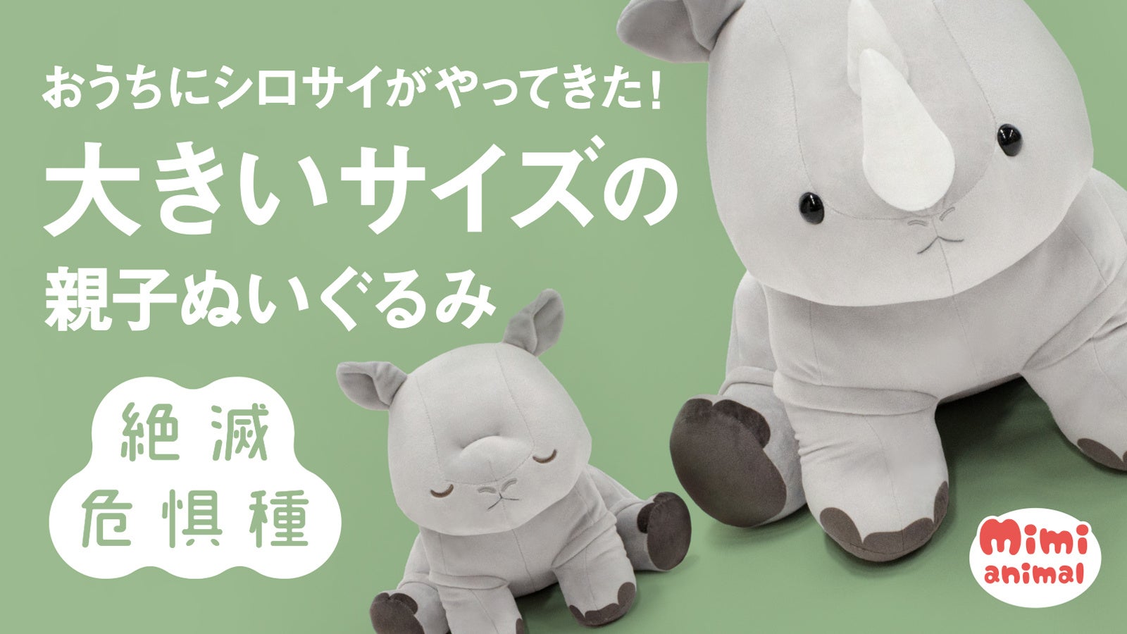 リアルだけど可愛い、インテリアにもマッチする大きいサイズのシロサイ親子のぬいぐるみです。