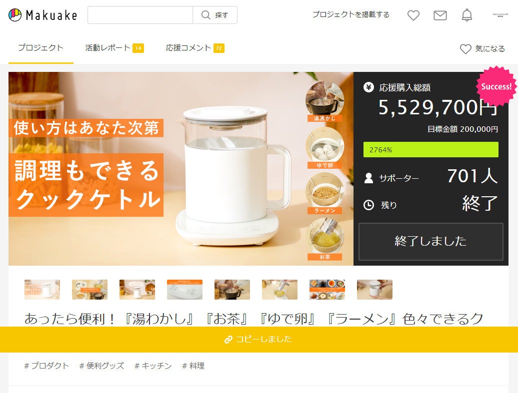 Makuake達成率2764%!! あったら便利!『湯わかし』『お茶』『ゆで卵』『ラーメン』色々できるクックケトルが一般発売スタート!