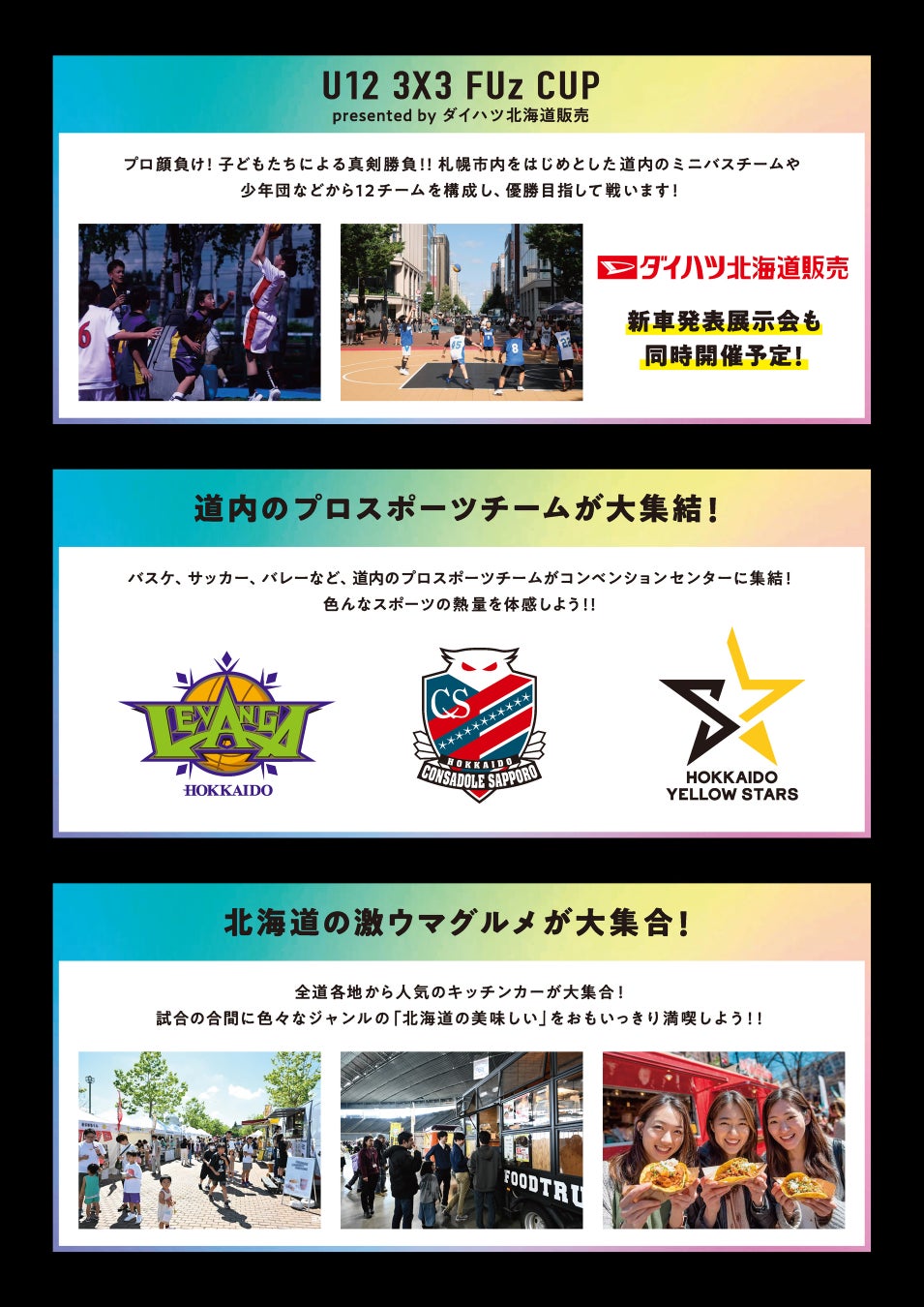 さらに、レバンガ北海道、北海道コンサドーレ札幌、北海道イエロースターズなど、北海道を代表するプロスポーツチームによるブース出展、またパートナー企業であるダイハツ北海道販売様による新車発表展示会や西野学園様による体験イベント、さらに無料で遊べるキッズエリアや全道各地から人気のキッチンカーが多数出店するなど、ご家族やご友人で一日中楽しめるイベントが盛り沢山となっておりますので、ぜひ飲食を楽しみながら、3x3のスピード感あふれる試合を会場でご覧ください!!