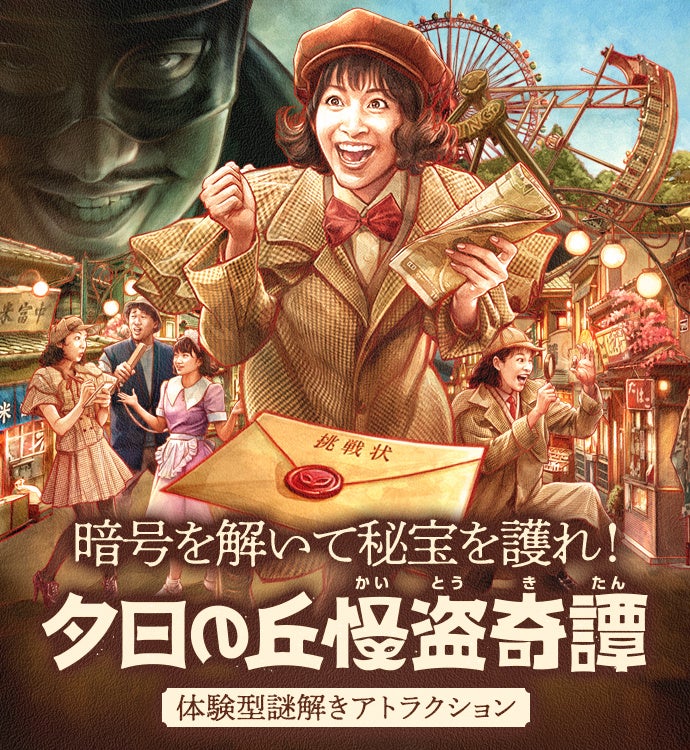 昨年11月5日より開催している、体験型謎解きアトラクション 「夕日の丘怪盗奇譚(ゆうひのおかかいとうきたん)」。世紀の大怪盗「怪人二十面相」からの挑戦に、ゲスト自身が知恵自慢の探偵となって、園内全域を使いながら謎を解きあかす体験が多くのゲストを物語の世界へと巻き込んでいます。