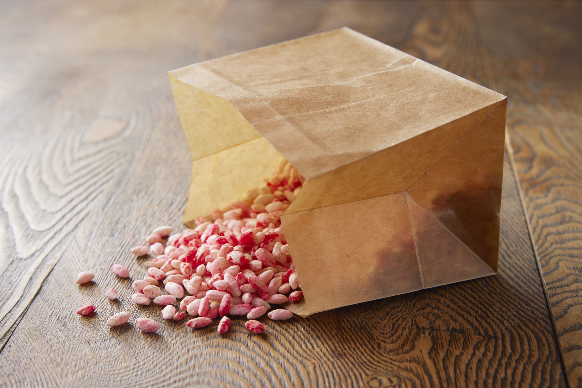 桜の木の下に店を構えるポン菓子屋ならではの桜吹雪をイメージしたピンク色のポン菓子が登場。色だけでなく、桜の風味を感じることができる春ならではのフレーバーポン菓子です。