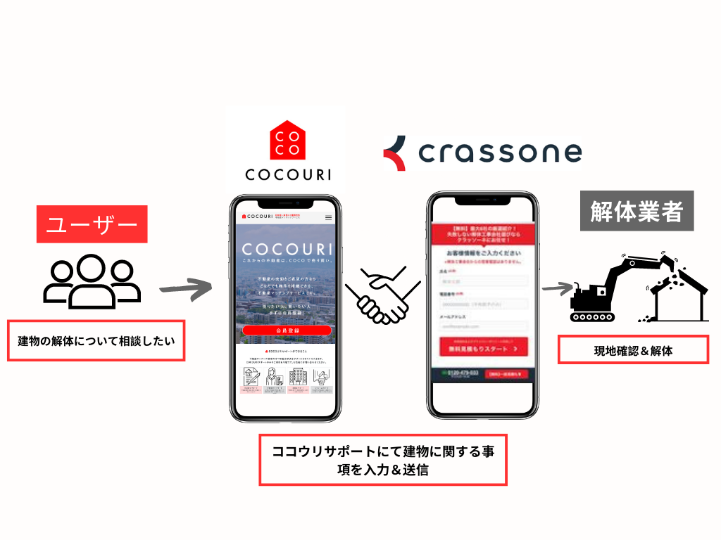 新しい不動産取引の形をご提供!売主と買主を直接つなぐ『COCOURI(ココウリ)』が売買サポート機能にて、解体工事の一括見積もりサービスを提供する株式会社クラッソーネと業務提携。