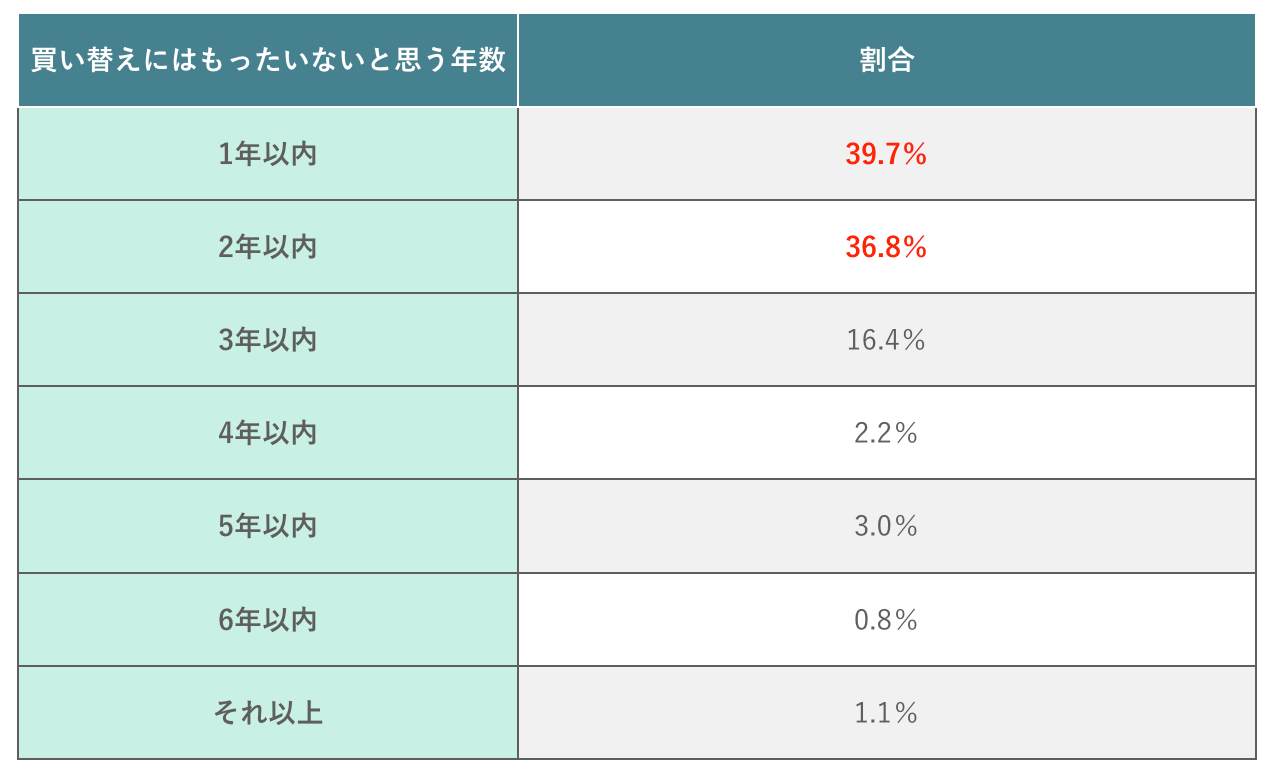 前項で、3年以上使い続ける人が8割を占めるという結果だったので、買い替えるともったいないと思う年数も近しい結果となっています。