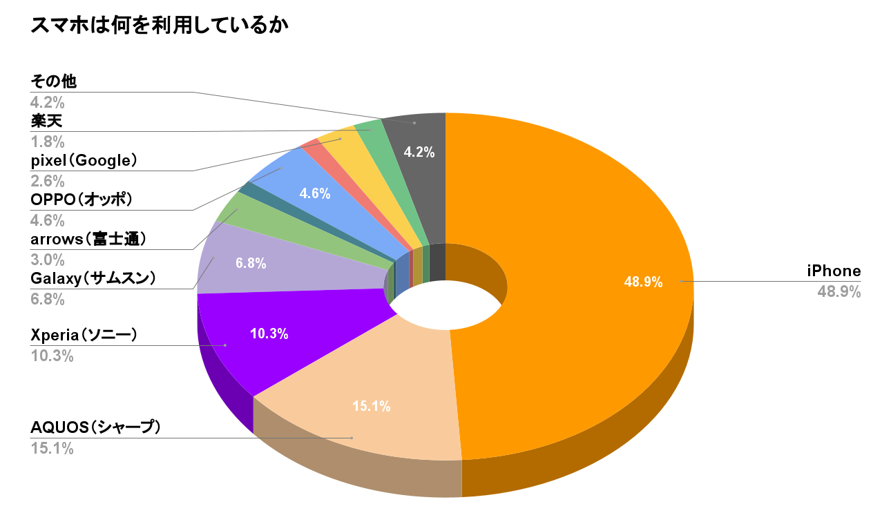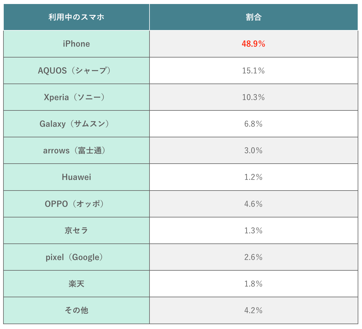 - 利用者が最も多いスマホはiPhoneで48.9%