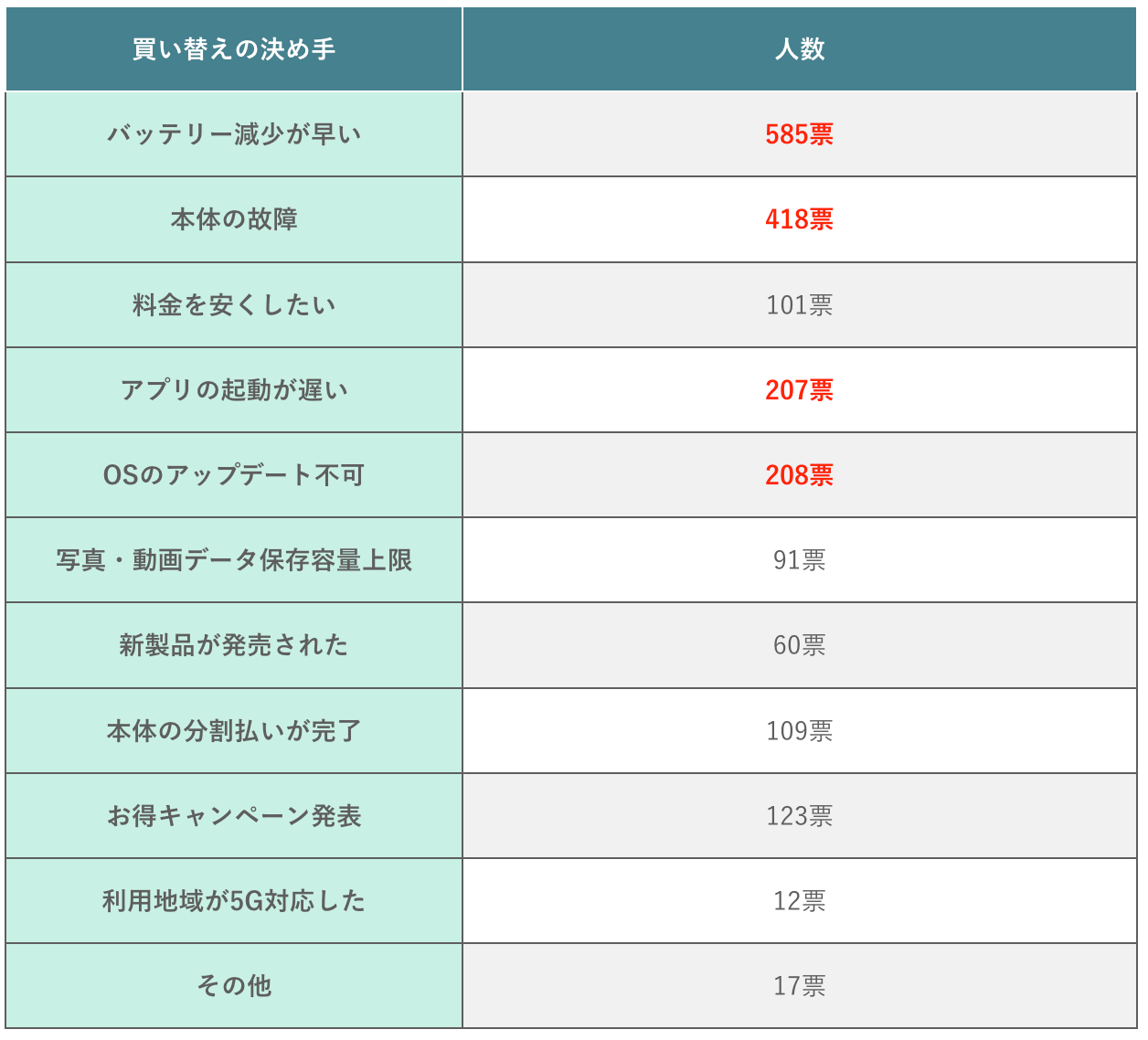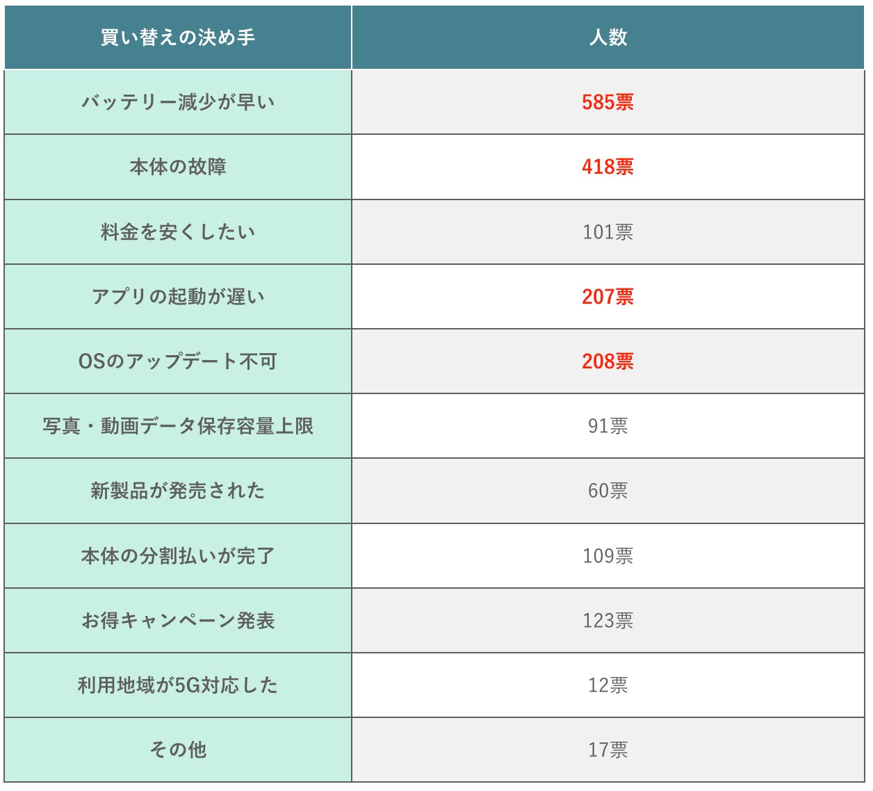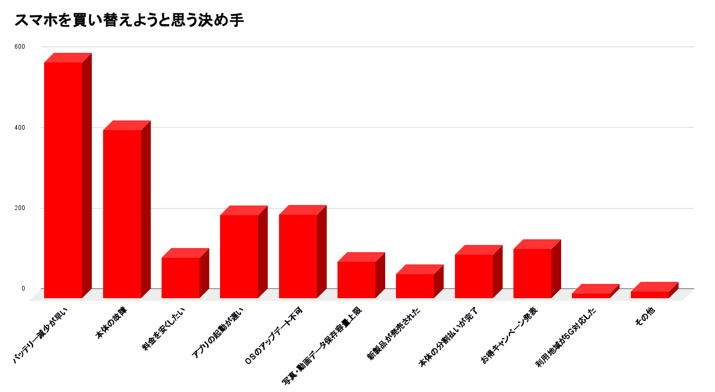 スマホを買い替える決め手をアンケート調査した結果は次の通りです。