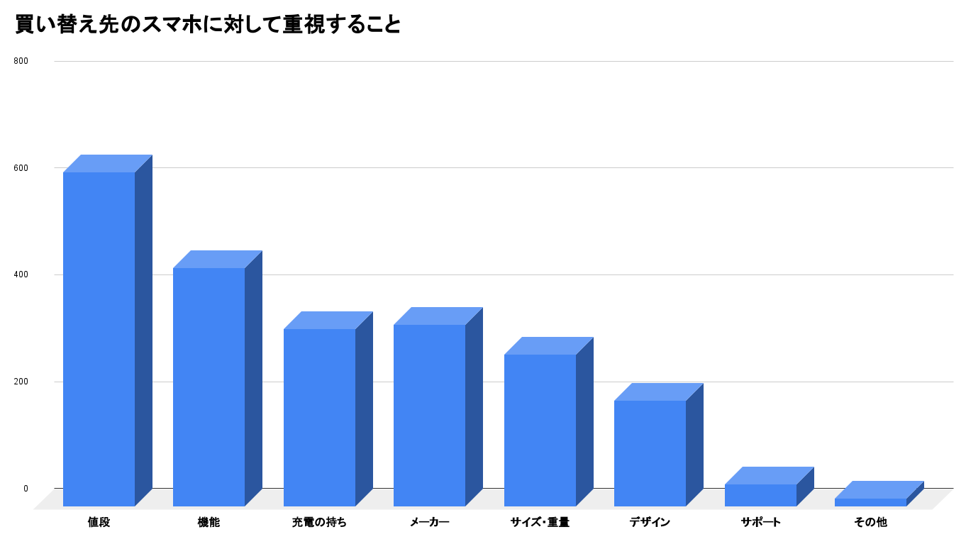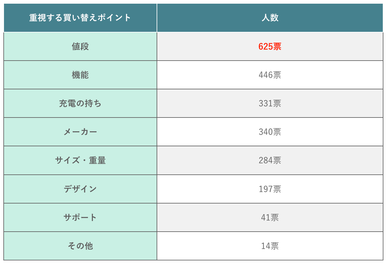 スマホを買い換える際に重視するポイントをアンケート調査した結果は次の通りです。