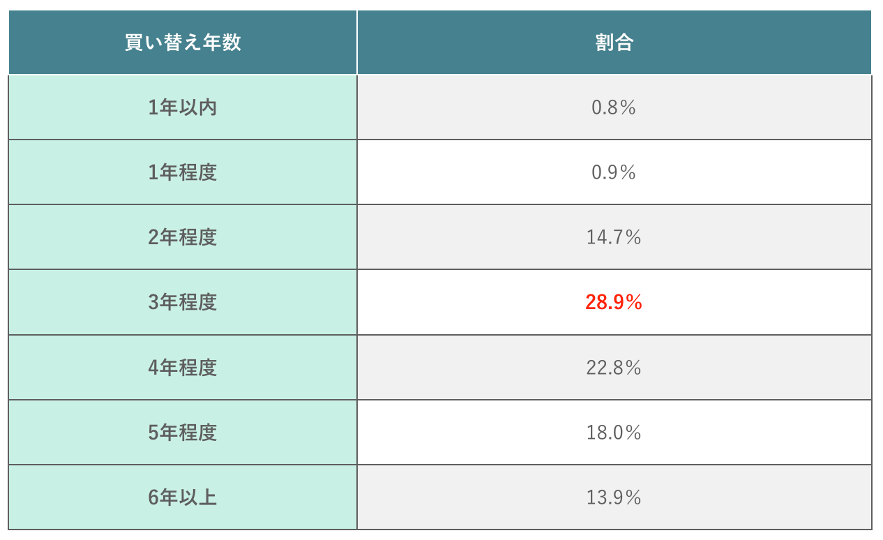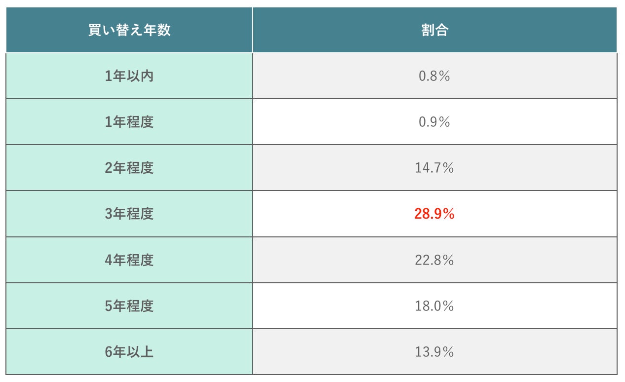 - スマホを買い替えるタイミングで最も多いのは3年程度