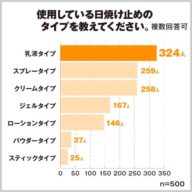 アンケートの結果、人気があるのは乳液タイプでしたが、スプレータイプやクリームタイプを使っている方も多くみられました。