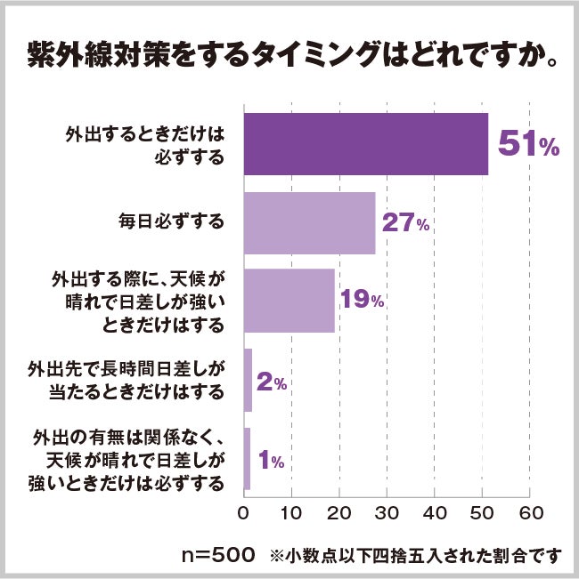 次に紫外線対策をするタイミングですが、「外出する時だけする」「外出時、天気が良いときだけ」と回答した人が7割になりました。