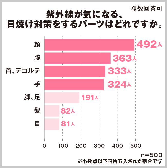 今回は紫外線が気になっている女性500人にどのような日焼け対策をしているか、使っている日焼け止めや紫外線対策の悩みについてお聞きしました。
