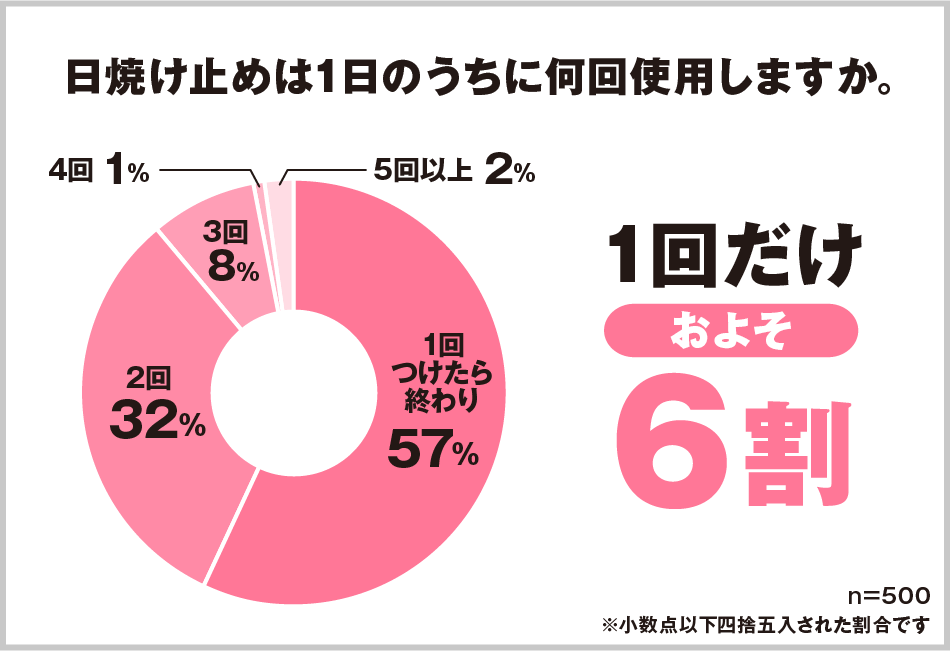 「日焼け止めを塗り直す回数」についても聞いてみたところ、およそ6割の人が「1回つけたら終わり」と答えています。