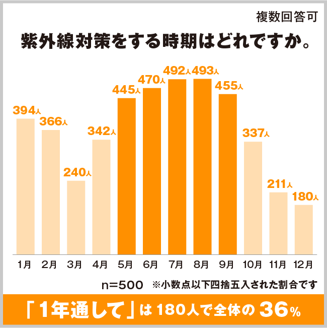 紫外線対策をしている時期について聞いてみたところ、やはり6〜8月が多いものの、5月や9月もかなりしっかり対策をされている方が多いようです。